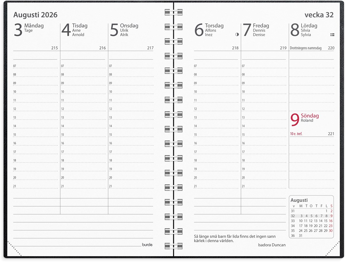 Format: 83x127 mm. Layout: Stående. Vecka/uppslag. Timindelning 7-21. Kalendarium: 2025-12-08 - 2027-01-03. Omslag: Konstläder. Spiralbunden. Innehåll: Atlas, Kyrkliga helgdagar, Flaggdagar, Helgdagar/aftnar, Månfaser, Namnsdagar, Internationella helgdagar översikt, Telefonregister, Temadagar/händelser, Årsöversikt/årsöversikter, Årsplan/årsplaner. Antal sidor: 152. Miljöinformation: FSC®.