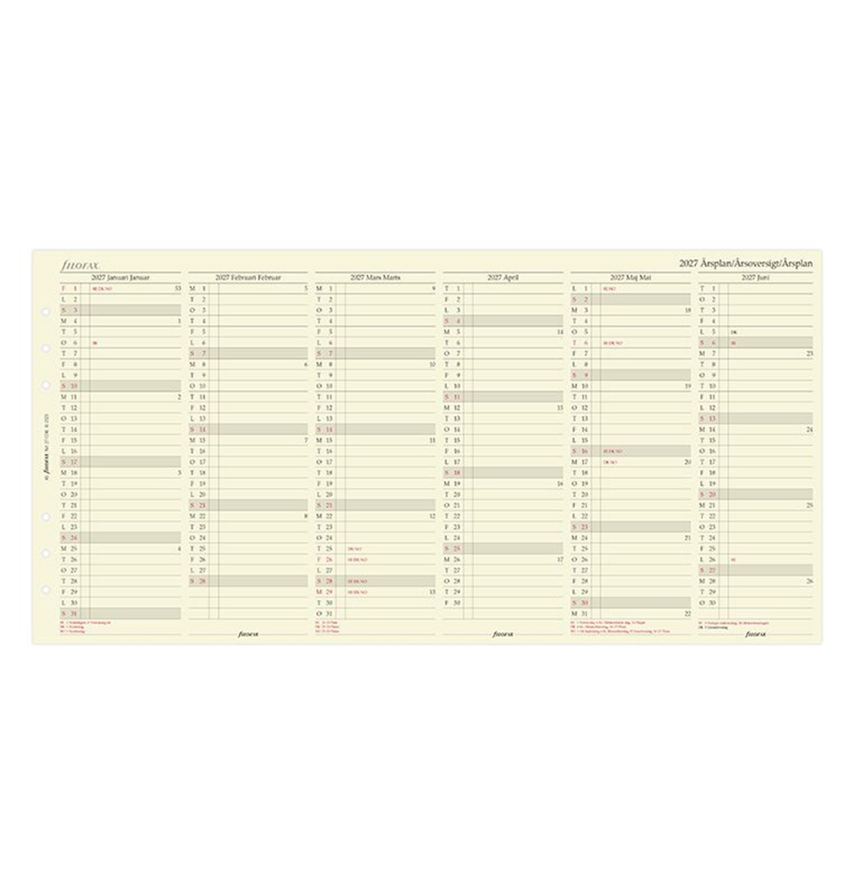 Utvikbar årsplan som passar till Filofax A5 systemkalender och Clipbook. Trespråkig (svenska, danska och norska).