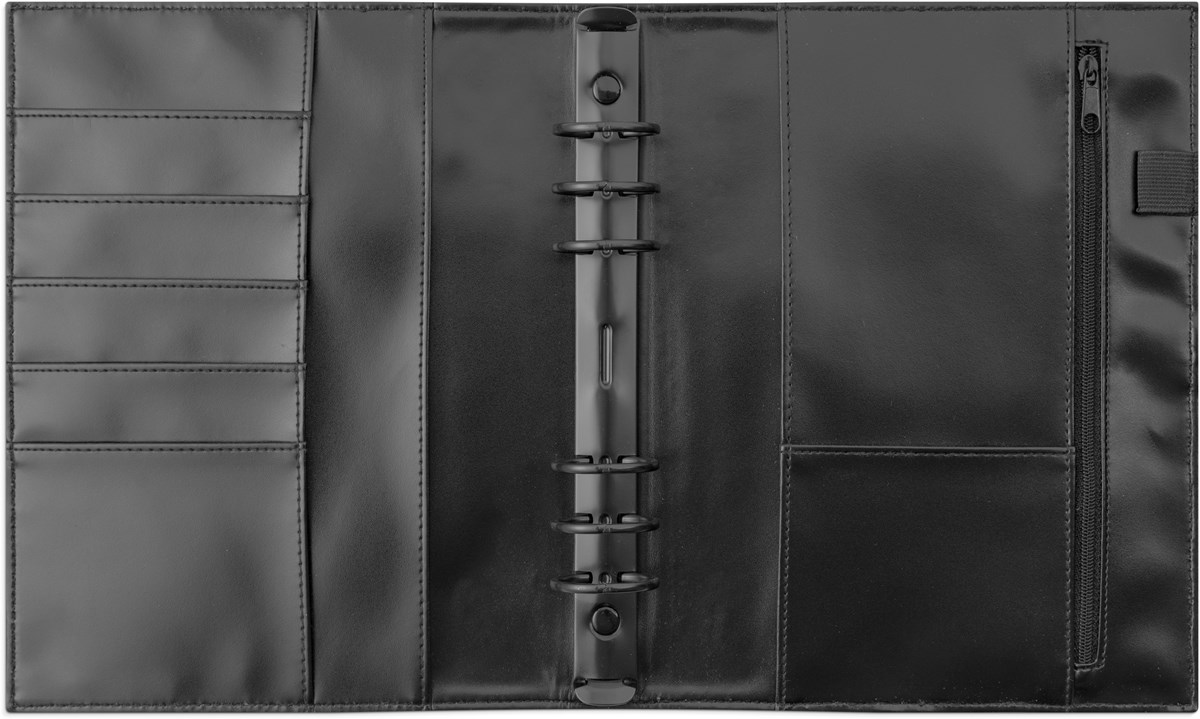 Systemkalender med grundsats. Grundsatsen innehåller hålad kalenderdel (4801) och blankettdel. Pärmen har ringmekanism (Ø 30 mm), fem kreditkortsfickor, stort myntfack med dragkedja, fack för kvitton o dyl och pennhållare. Format pärm: 185x235 mm (A5).