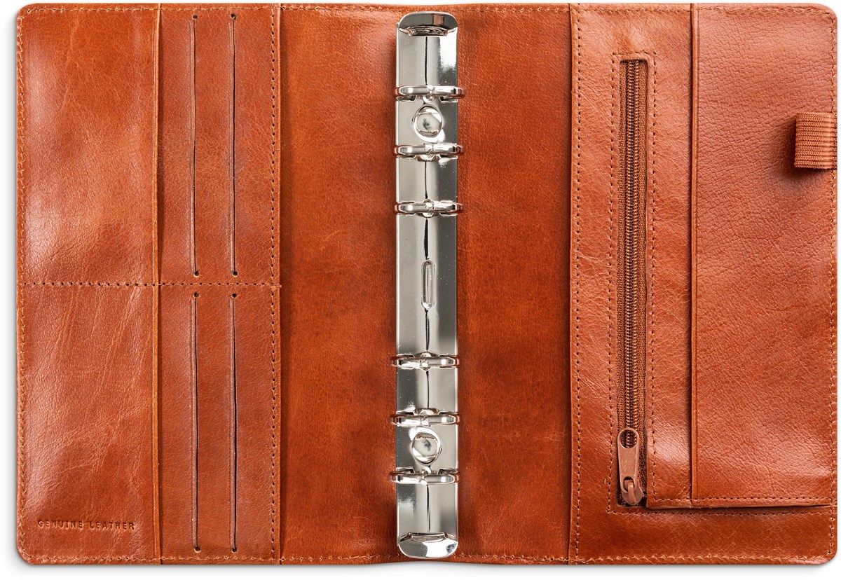 Systemkalender med grundsats. Grundsatsen innehåller hålad kalenderdel (4601) och blankettdel. Pärmen har ringmekanism (Ø 20 mm), se kreditkortsfickor, myntficka, fack för kvitton o dyl och pennhållare. Format pärm: 135x195 mm.