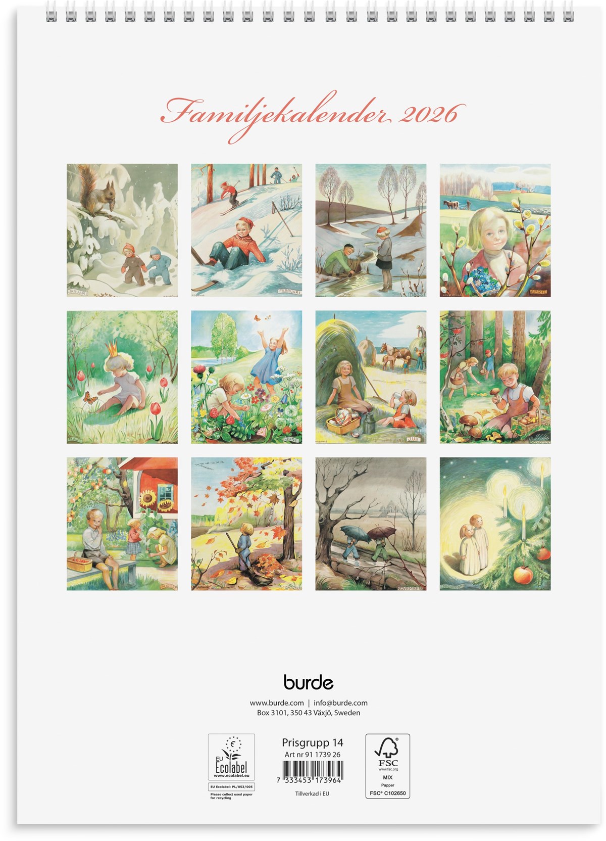 FamiljeFormat: A4. Layout: Månad/blad. Kalendarium: 2026-01-01 - 2026-12-31. Spiralbunden. Innehåll: 4 kolumner, Flaggdagar, Helgdagar/aftnar, Månfaser, Namnsdagar, Temadagar/händelser. Antal sidor: 12. Miljöinformation: FSC®. Ecolabel.