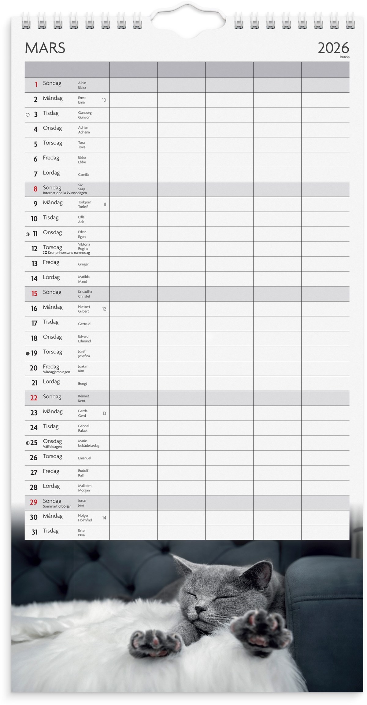 En väggkalender med fem kolumner för familjeplanering. Kalendern har månadsuppslag med kattmotiv, pappersficka, flaggdagar, månfaser och namnsdagar. Antal sidor: 12. Format: 220x430 mm.