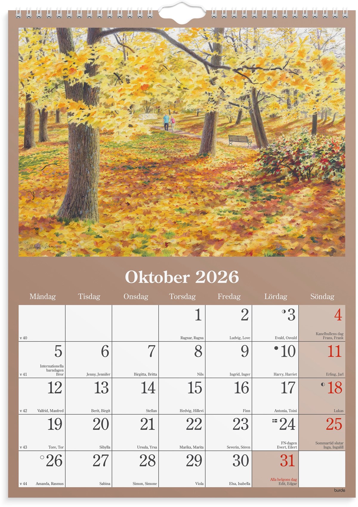 Format: A3. Layout: Månad/blad. Kalendarium: 2026-01-01 - 2026-12-31. Spiralbunden. Innehåll: Flaggdagar, Helgdagar/aftnar, Månfaser, Namnsdagar, Temadagar/händelser. Antal sidor: 12. Miljöinformation: FSC®. Ecolabel.