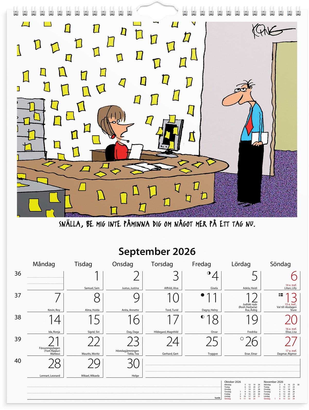 Format: 295x390 mm. Layout: Månad/blad. Kalendarium: 2026-01-01 - 2026-12-31. Spiralbunden. Innehåll: Kyrkliga helgdagar, Flaggdagar, Helgdagar/aftnar, Månfaser, Namnsdagar, Temadagar/händelser. Antal sidor: 12. Miljöinformation: FSC®.
