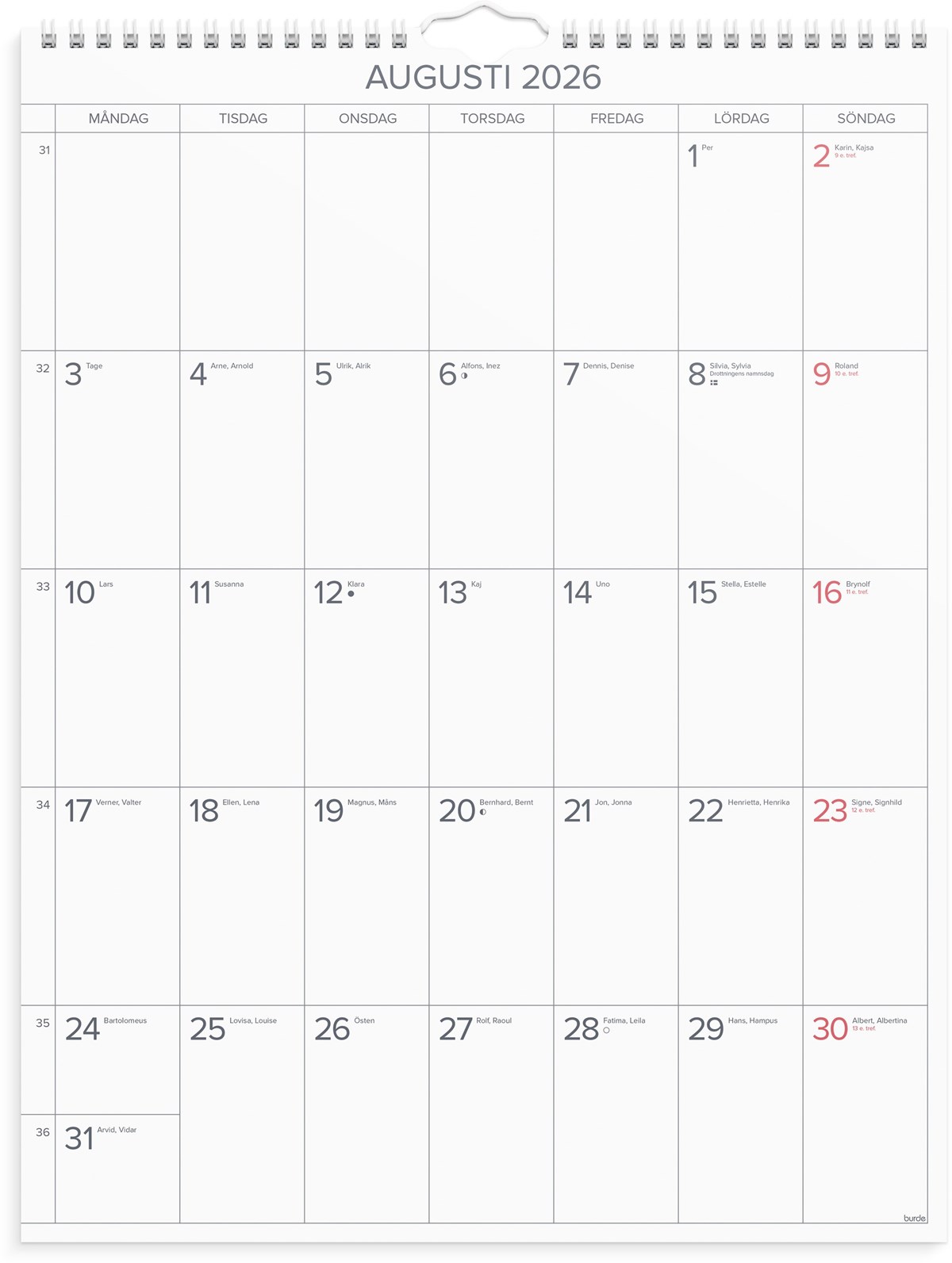 Format: 295x390 mm. Layout: Månad/blad. Kalendarium: 2026-01-01 - 2026-12-31. Spiralbunden. Innehåll: Kyrkliga helgdagar, Flaggdagar, Helgdagar/aftnar, Månfaser, Namnsdagar, Temadagar/händelser, Årsöversikt/årsöversikter. Antal sidor: 12. Miljöinformation: FSC®.