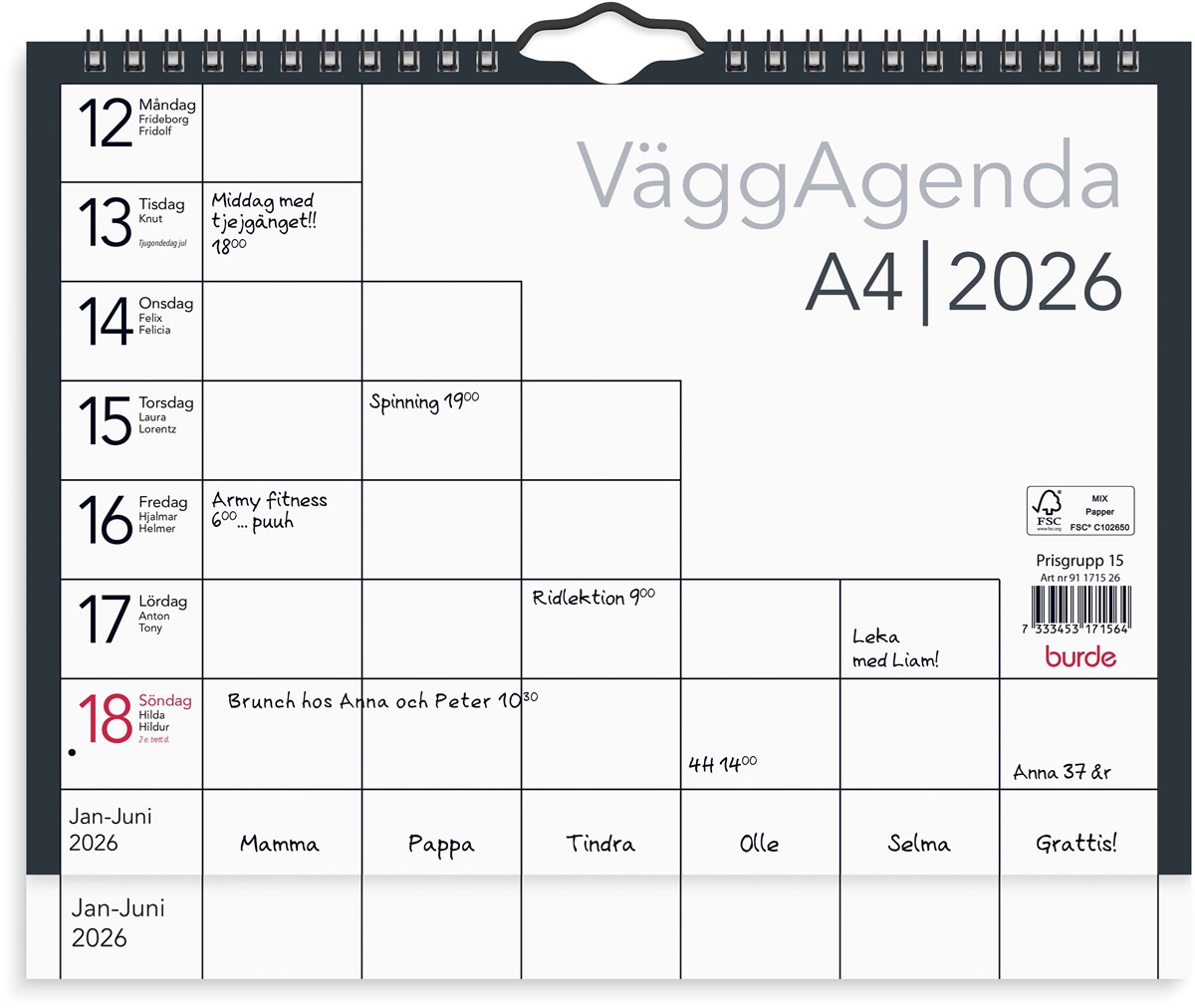 Format: A4. Layout: Vecka/blad. Kalendarium: 2025-12-29 - 2026-01-03. Spiralbunden. Innehåll: 6 kolumner, Kyrkliga helgdagar, Flaggdagar, Helgdagar/aftnar, Månfaser, Namnsdagar, Temadagar/händelser, Årsplan/årsplaner. Antal sidor: 52. Miljöinformation: FSC®.