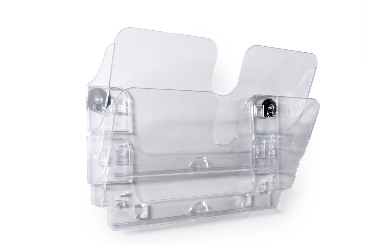 Blankettfack, broschyrställ, postfack - FLEXIPLUS med magnetiskt fäste är en serie med platsbesparande hållare, som utan verktyg lätt kan sättas upp och flyttas på magnetiska ytor. Varje fack har måtten 34x19,5x3,5 cm (BxHxD) och en kapacitet på 24 mm tjocka buntar med broschyrer, blanketter och annan information i A4-format. Detta är ett komplett set med 2 fack i liggande format där facken kan monteras ihop eller användas var för sig.