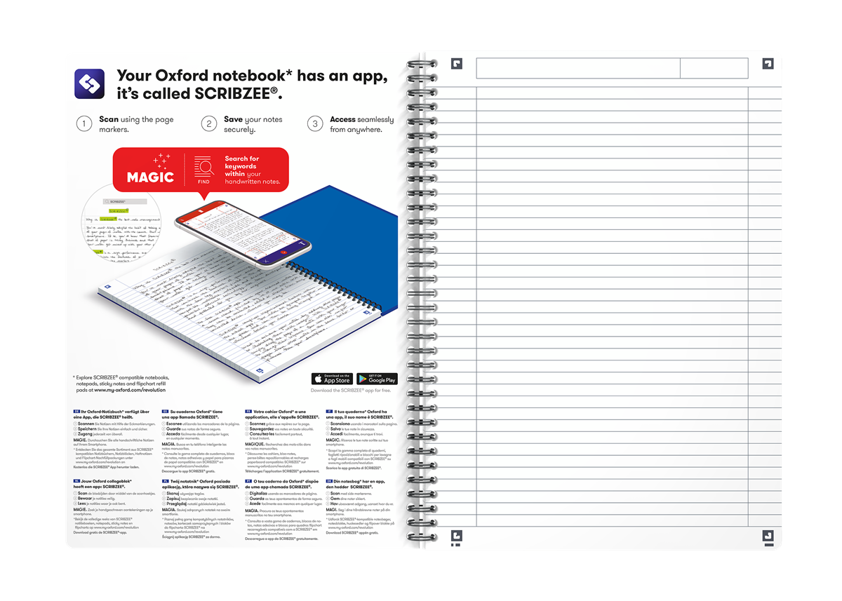 Vatten- och smutsavvisande omslag Omslag tillverkat av återvunnen plast Bläcket blödet inte igenom pappret Dubbelspiral, fastnar inte i väskan Scribzee, skanna dina anteckningar