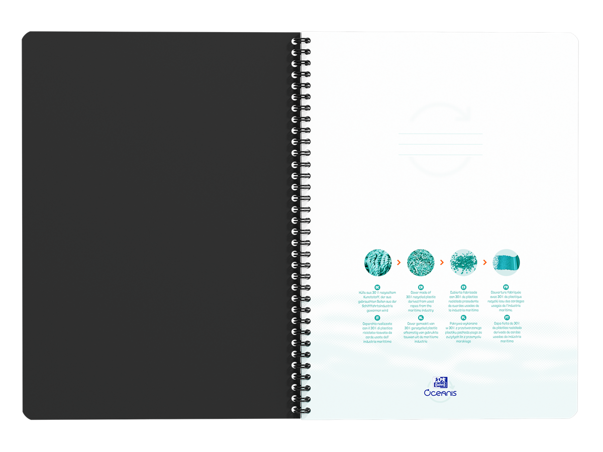 Omslag i slitstark polypropylen som till 30% är tillverkad av återvunna rep och fiskenät från havets botten, twin-wire-spiral som inte fastnar i väskan. 90 blad linjerat vitt Optik paper+ som motverkar motljus och är behagligt att skriva på. Bläcket blöder inte igenom pappret vilket gör att båda sidor kan nyttjas. Kompatibel med Scribzee. Skanna dina noteringar och kom åt dom när som helst via molnet. Blandade färger. 5 st/förp.