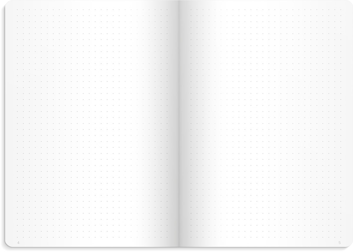 Omslag i konstläder, gummiband. Innehåller punktade sidor, 80 g, 128 blad. Inbunden. Format: A5.