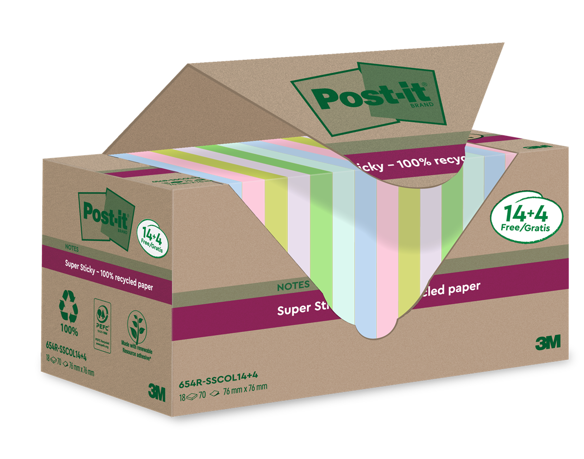 Post-it® Recycled Super Sticky Notes är tillverkade av 100 % återvunnet papper och är återvinningsbara. Dessa självhäftande notes är perfekta för att göra anteckningar eller lämna meddelanden och påminnelser på. De är perfekta för vertikala och ojämna ytor så att du kan fästa dem där du behöver dem. Super Sticky Notes har dubbelt så stark häftförmåga som Post-it® Original Notes, så du kan vara säker på att ditt meddelande sitter kvar. Tillverkas av PEFC-certifierade pappersfibrer, som kommer från hållbart skogsbruk och kontrollerade resurser. De har ett häftämne som tillverkas av en förnybar resurs, som till 60 % kommer från en växt som växer upp igen varje år. Förpackningen tillverkad av återvunnen wellpapp kan användas för att enkelt förvara dina notes i ett skrivbord eller skåp och kan återvinnas när de inte behövs längre.