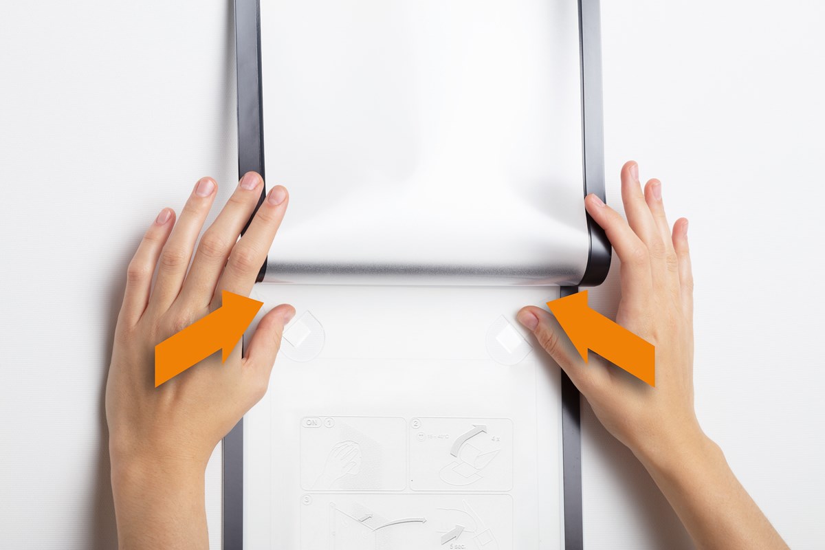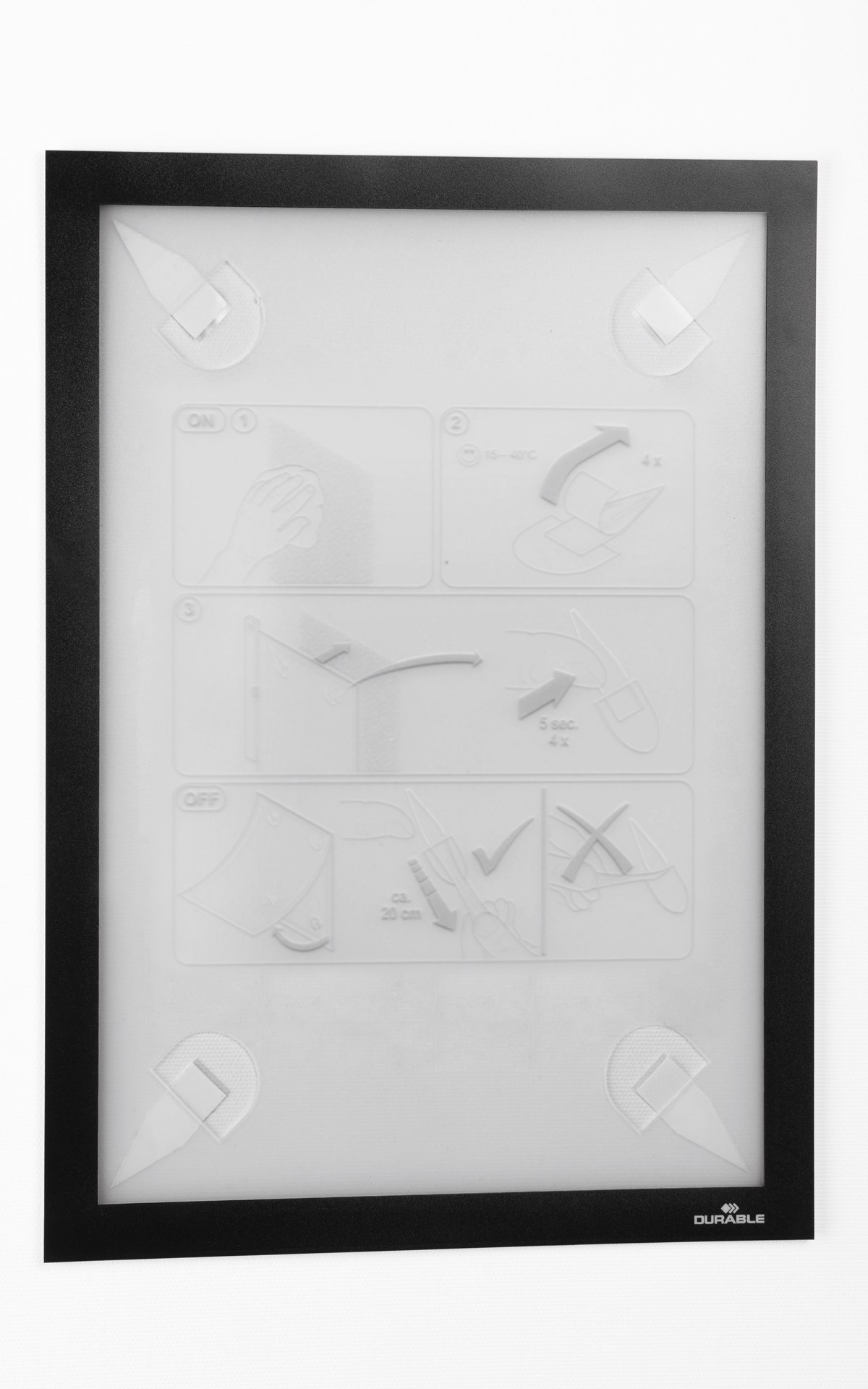 DURAFRAME® WALLPAPER – fästs med självhäftande klisterremsor. För känsliga ytor och ojämna underlag. Kan fästas på tapet, trä och flertalet plastytor och avlägsnas utan att efterlämna märken eller skada underlaget. Ersättningssats med fyra klisterremsor ingår. Innehållet kan snabbt sättas in och bytas ut tack vare den öppningsbara magnetramen. För stående och liggande format.