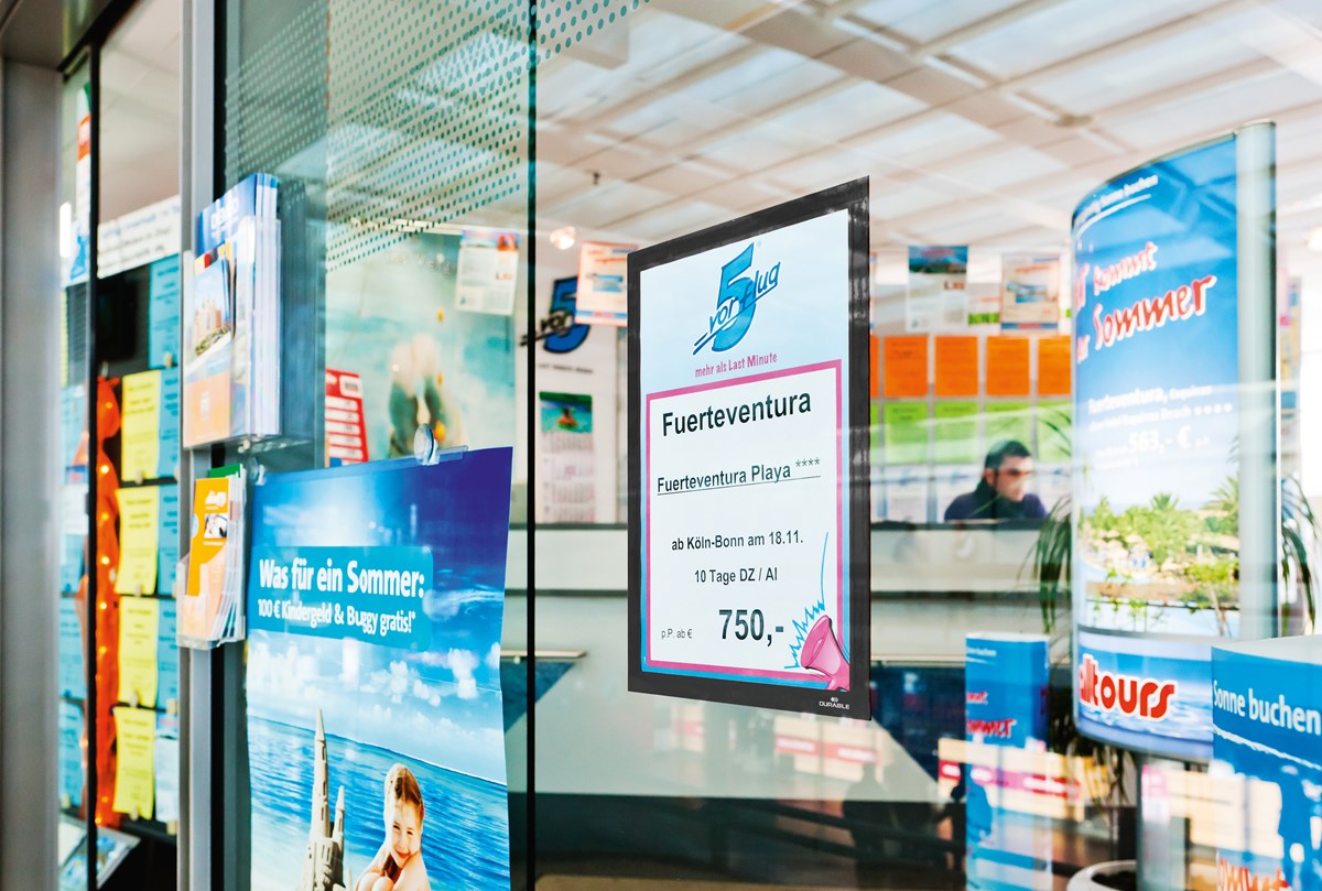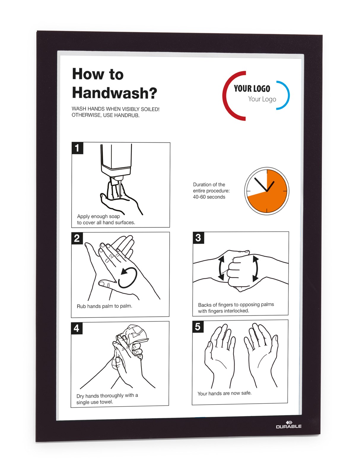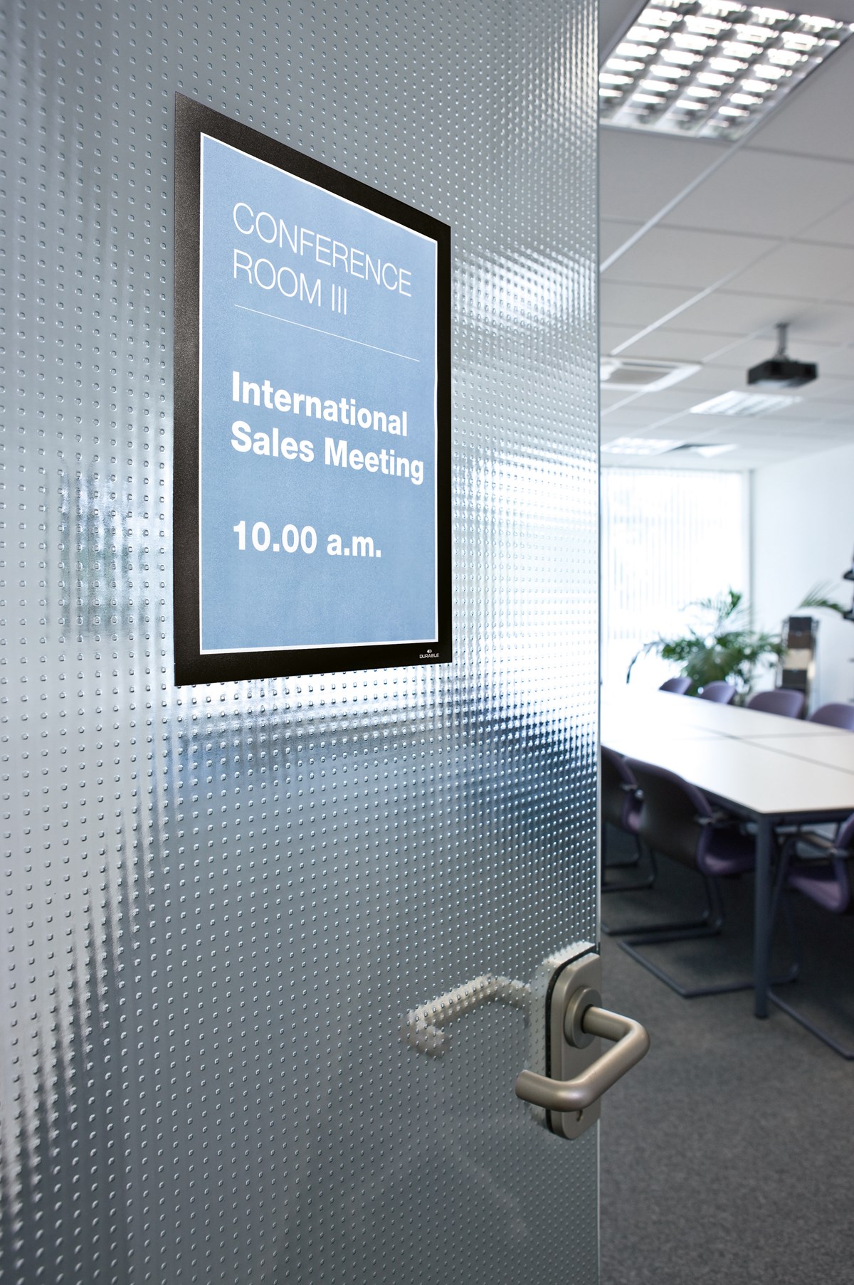 Vid användning på glas är informationen läsbar från båda sidor. Undvik att fästa på ytor som tapeter, porösa material och non-stick-ytor. Målade ytor kan ev. skadas om ramen tas bort. För stående och liggande format. 2 st/förp.