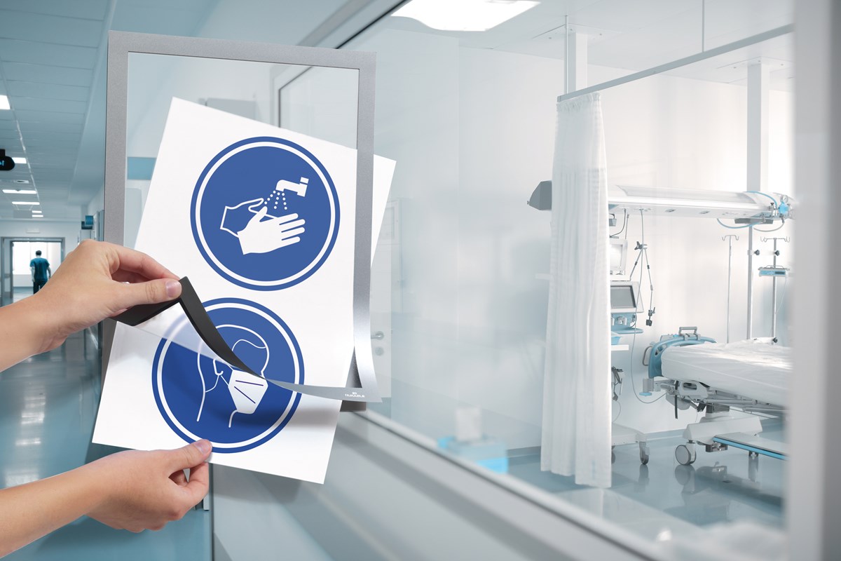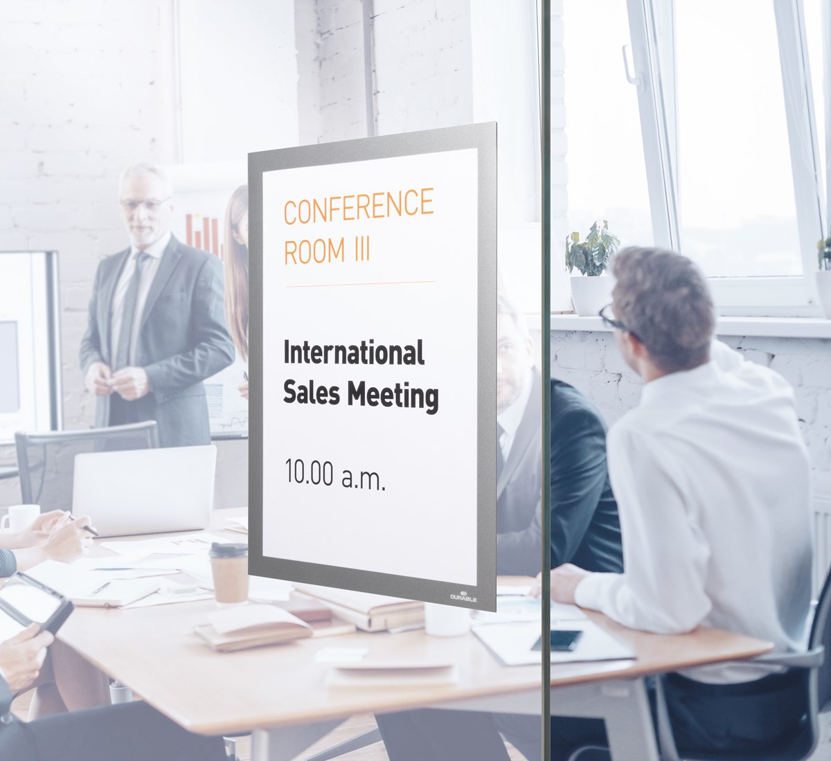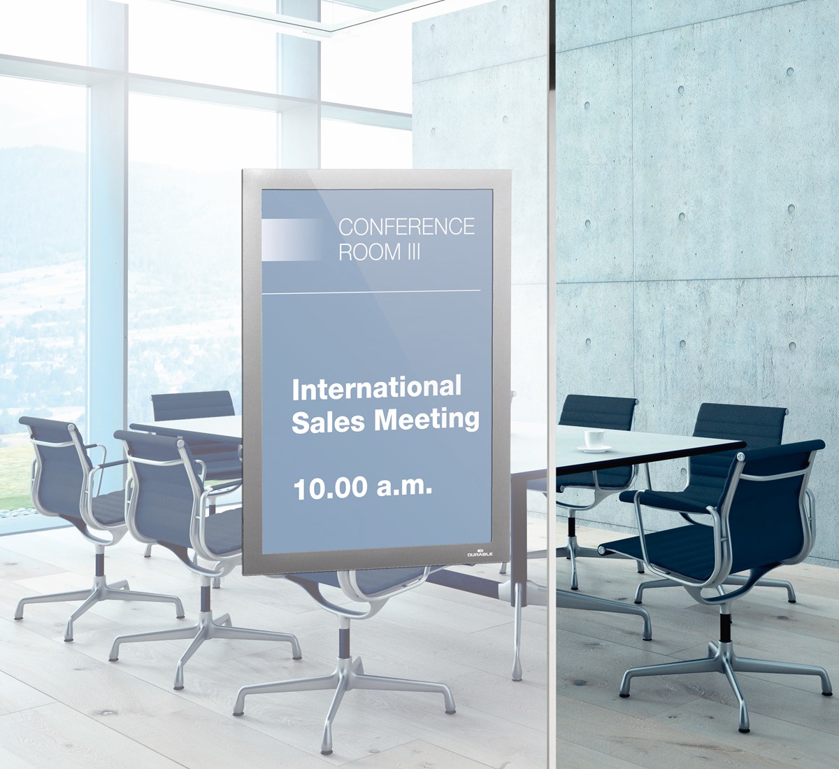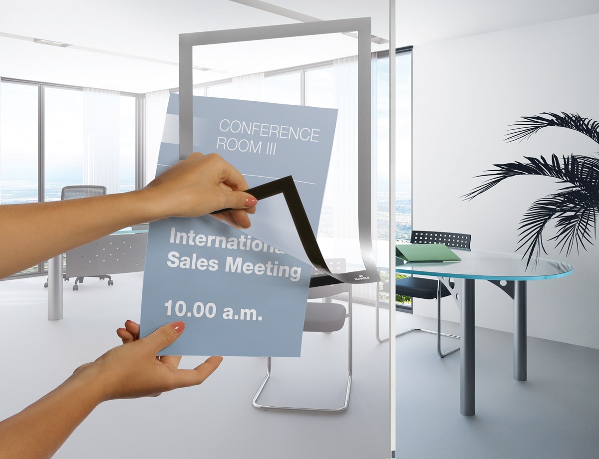 Vid användning på glas är informationen läsbar från båda sidor. Undvik att fästa på ytor som tapeter, porösa material och non-stick-ytor. Målade ytor kan ev. skadas om ramen tas bort. För stående och liggande format. 2 st/förp.