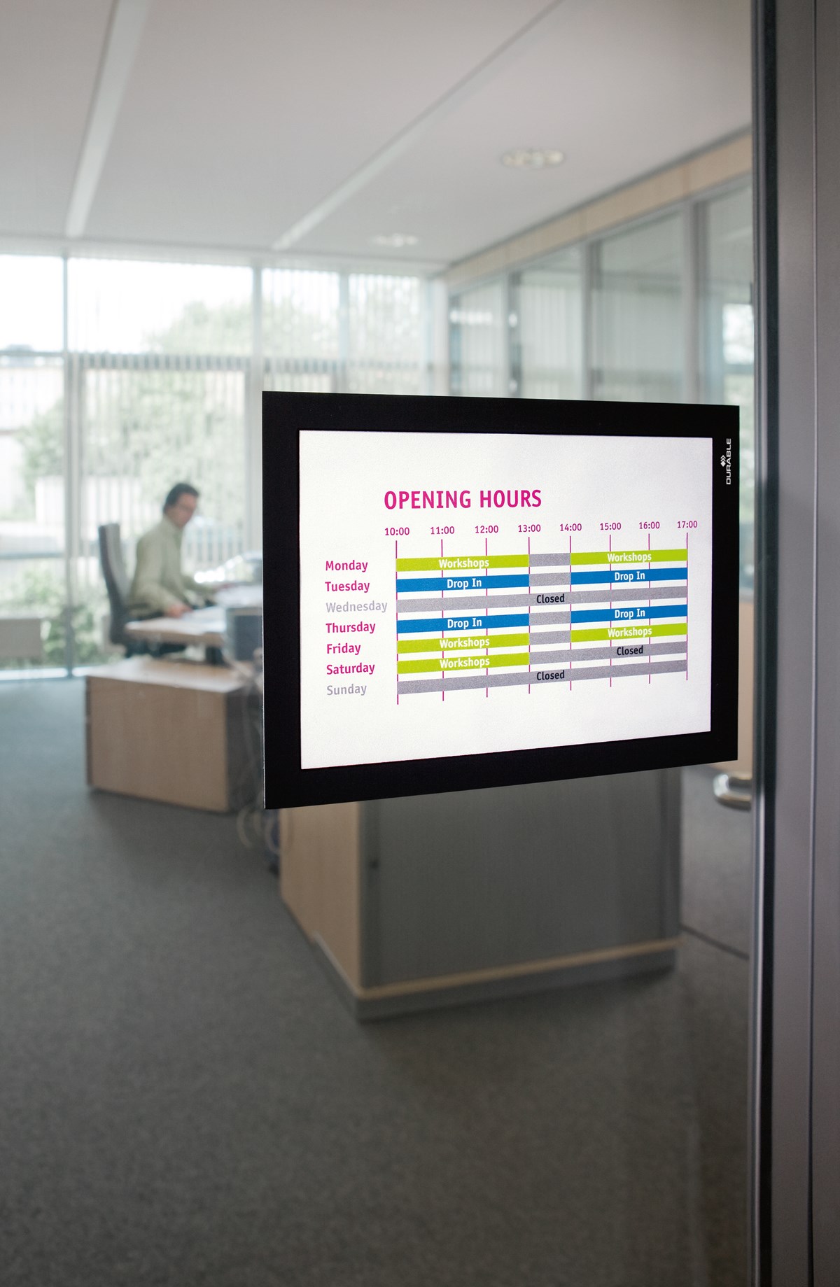 • Kan fästas på alla fasta och släta ytor. Vid användning på glas är informationen läsbar från båda sidor. Undvik att fästa på ytor som tapeter, porösa material och non-stick-ytor. Målade ytor kan ev. skadas om ramen tas bort.