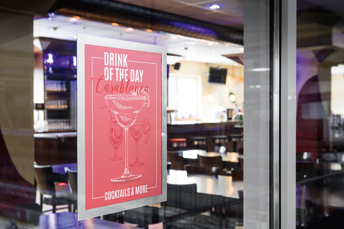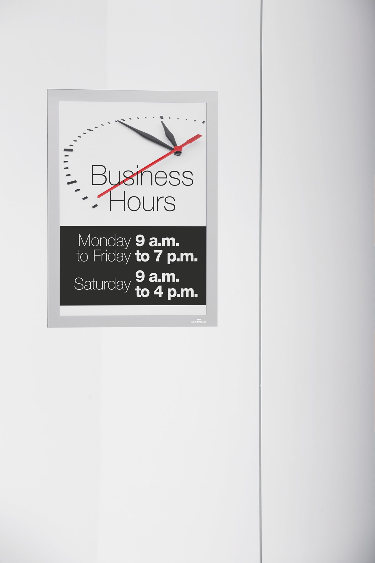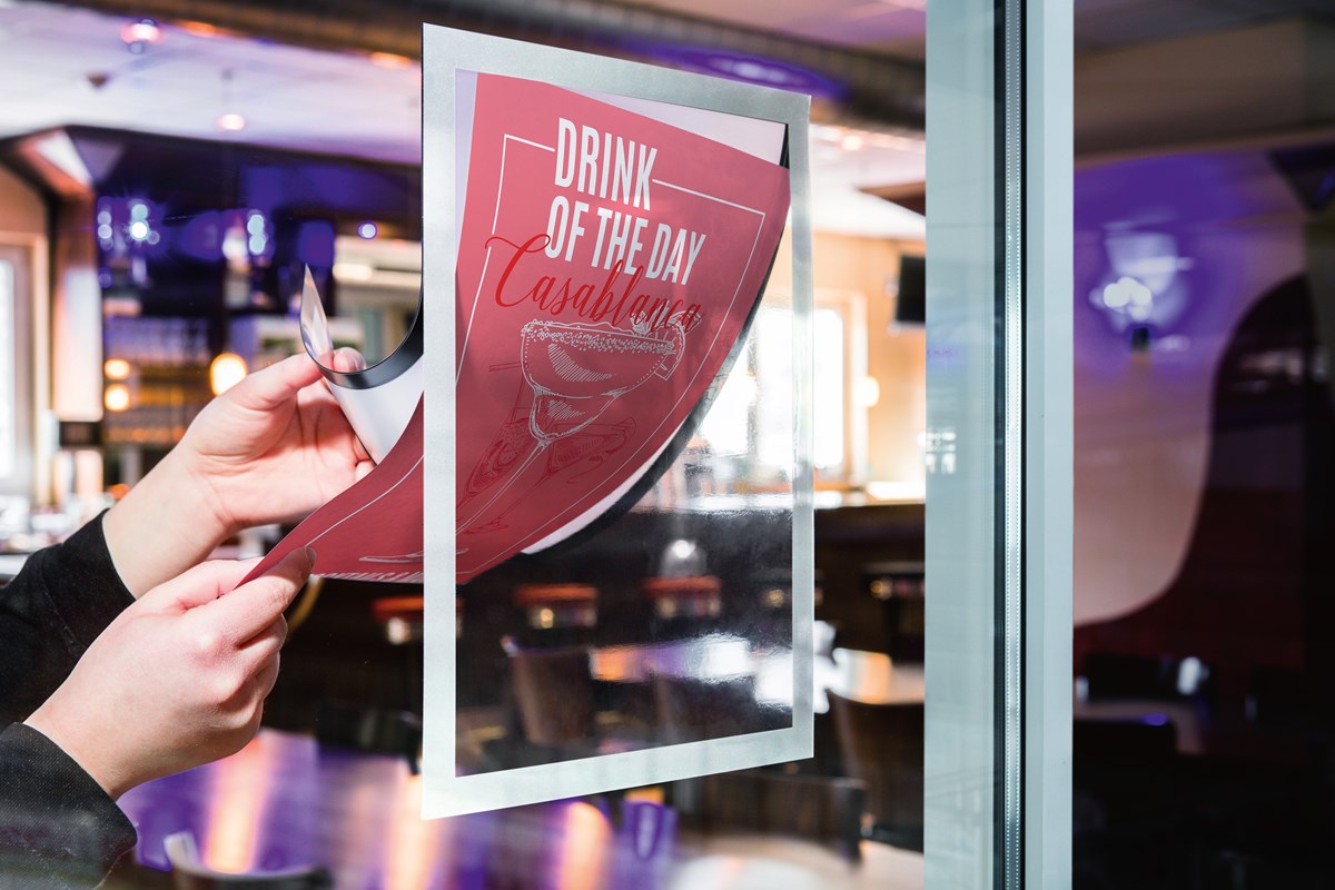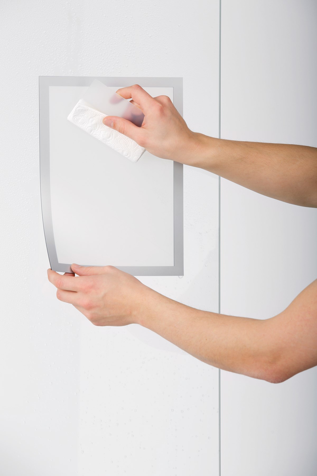 Fäster statiskt, för glasytor som exponeras för solljus. Lätt och bubbelfri montering. Kan tas bort och åter sättas upp. Värmetålig upp till 70 °C. UV-stabil upp till 2 år. Innehållet kan snabbt sättas in och bytas ut tack vare den öppningsbara magnetramen. För stående och liggande format. 2 st/förp.