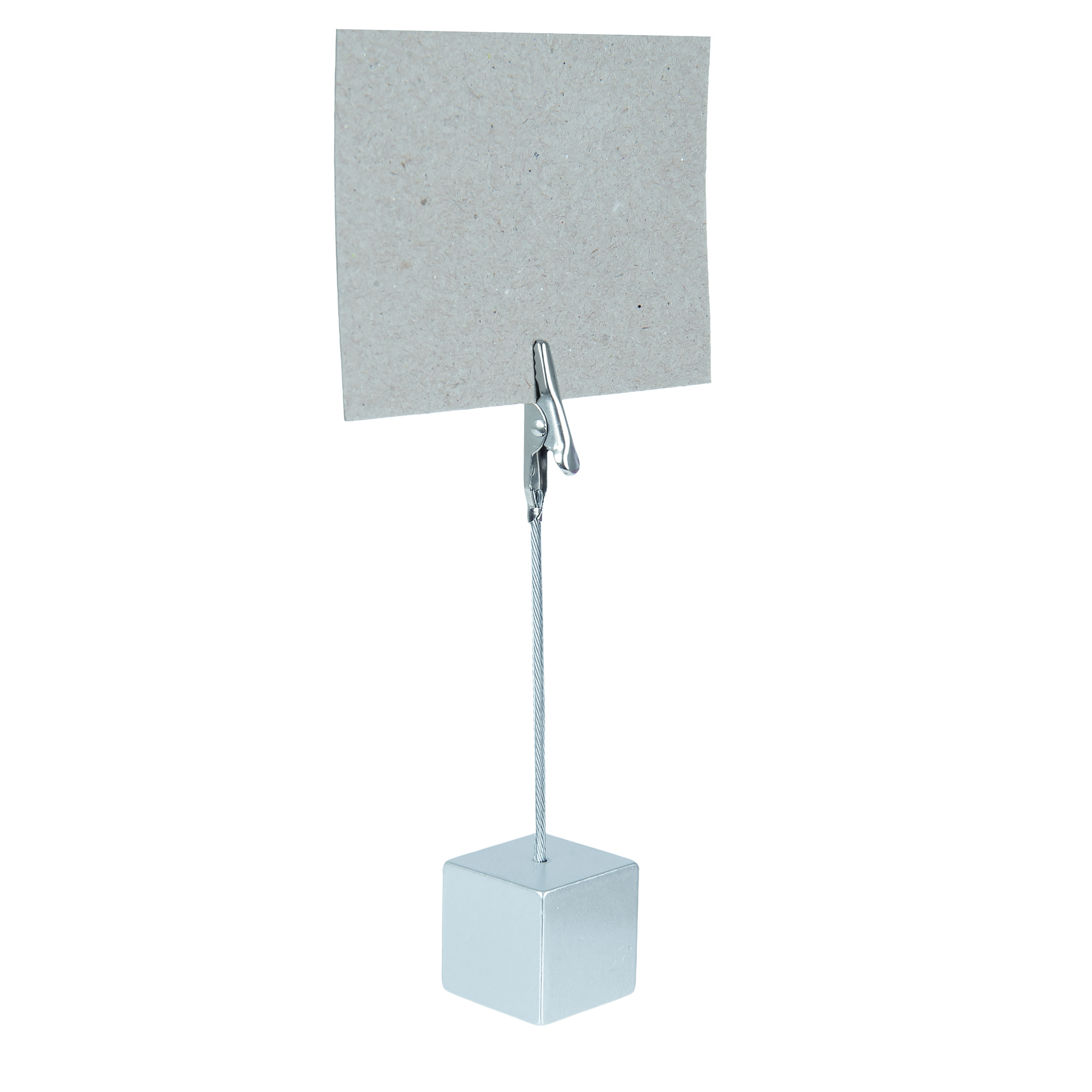 Krokodilklämma på stång med fot. Höjd: 11,5 cm. Fot: 2,5 x 2,5 cm.