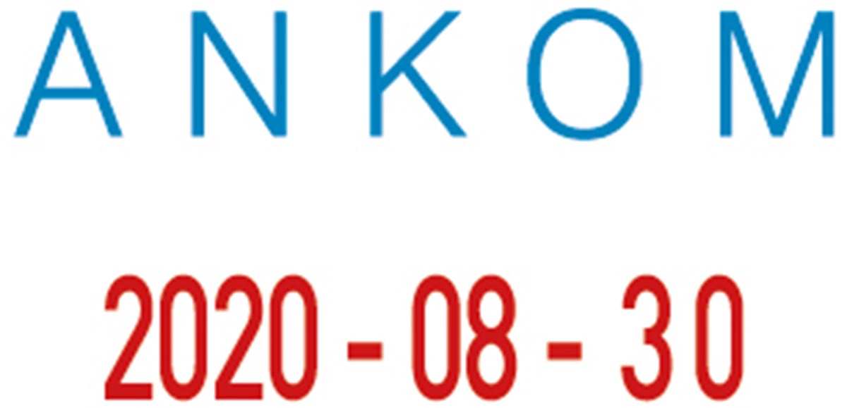 Liten, behänding datumstämpel med inbyggd dynkasett. Text: Ankom + datum. Röd/blått avtryck. Textstorlek: 4 mm. Storlek på avtryck: 25x13 mm.