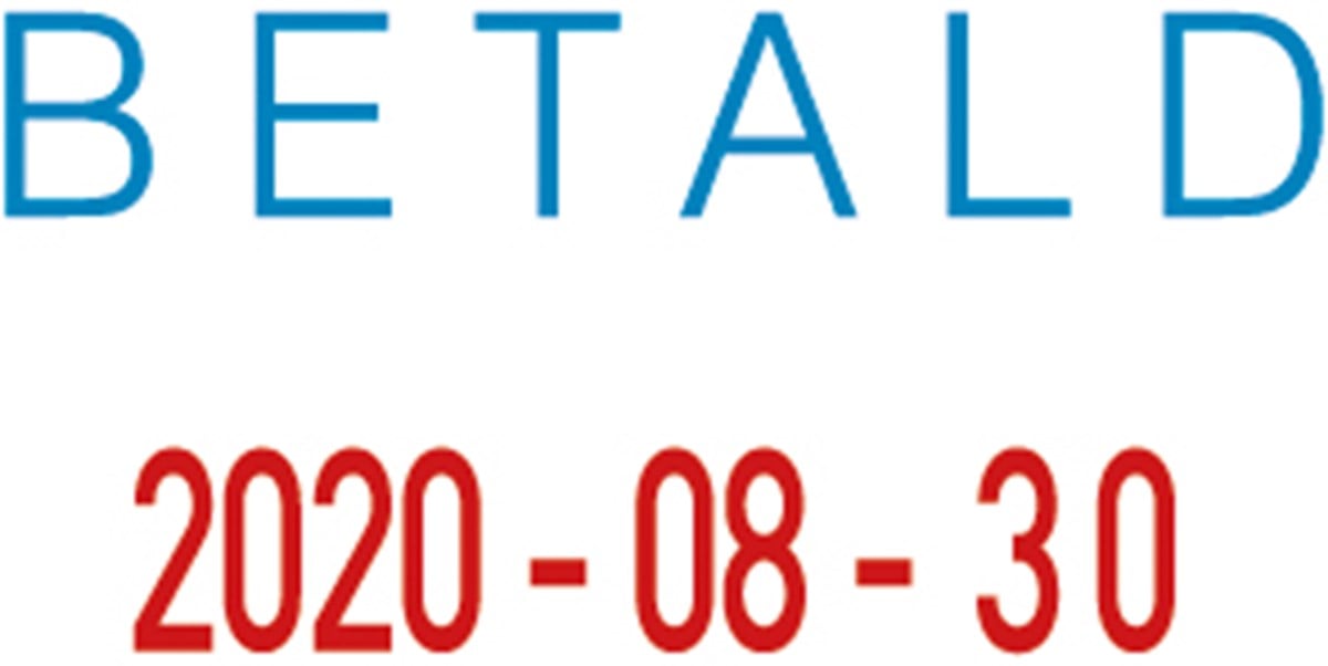 Liten, behänding datumstämpel med inbyggd dynkasett. Text: Betald + datum. Röd/blått avtryck. Textstorlek: 4 mm. Storlek på avtryck: 25x13 mm.