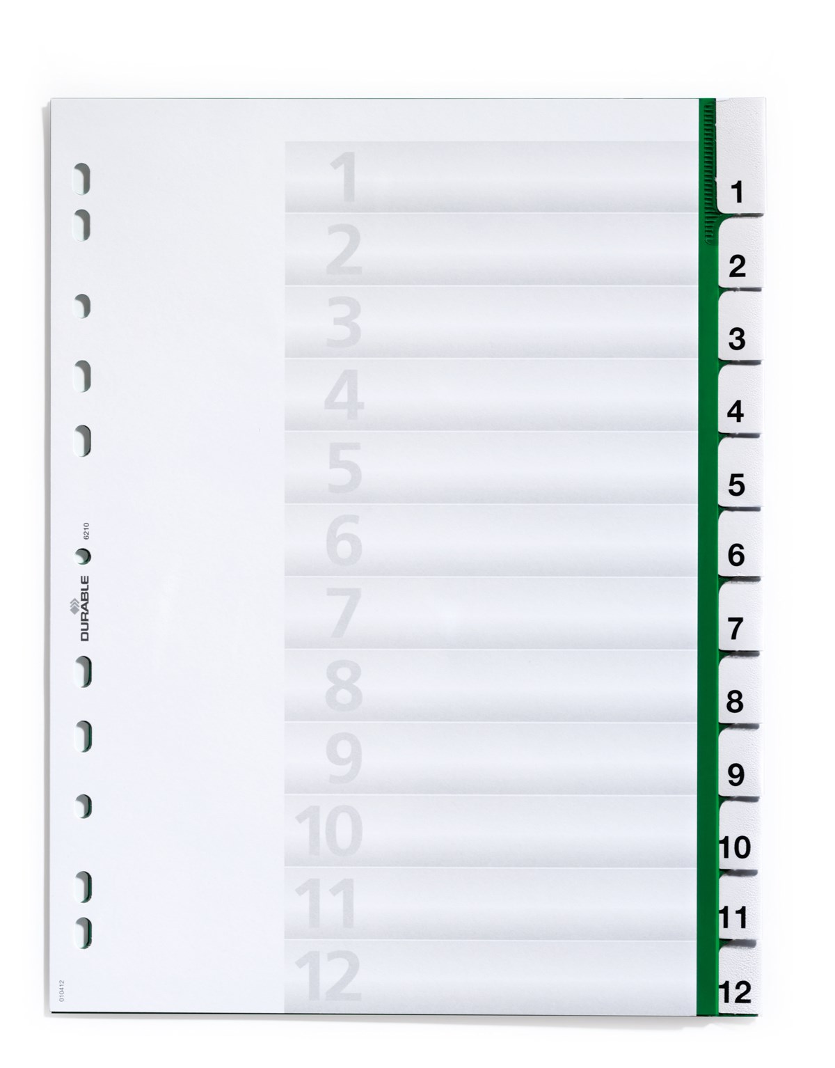 Grönt plastregister med extra hög slitstyrka med svetsade flikar av instickstyp. Plasten har en smutsavvisande yta. Till varje register medföljer försättsblad samt neutrala och förtryckta instick. Mallar för att skriva ut snygga försättsblad finns på www.duraprint.se.