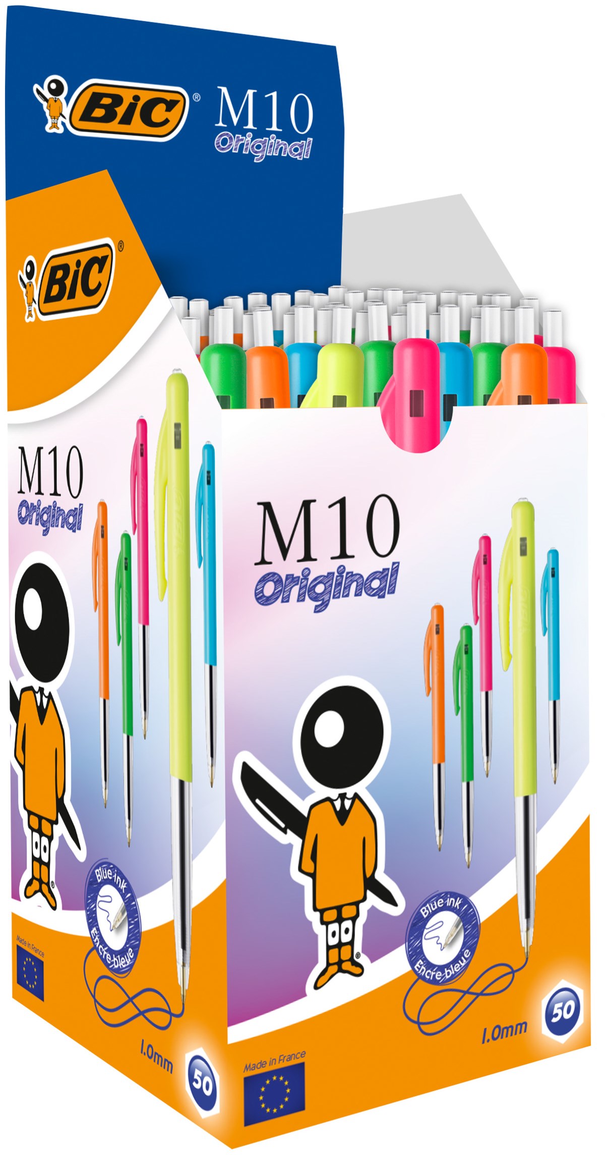 Klassisk kulspetspenna med tryckmekanism på sidan och räfflor runt greppet. Kulbredd 1,0 mm, skrivbredd 0,4 mm. Skrivlängd ca 2000 m. Dokumentäkta bläck enligt ISO 12757-1 och 12757-2. Blandade färger (gul, grön, orange, rosa och blå). 50 st/förp.