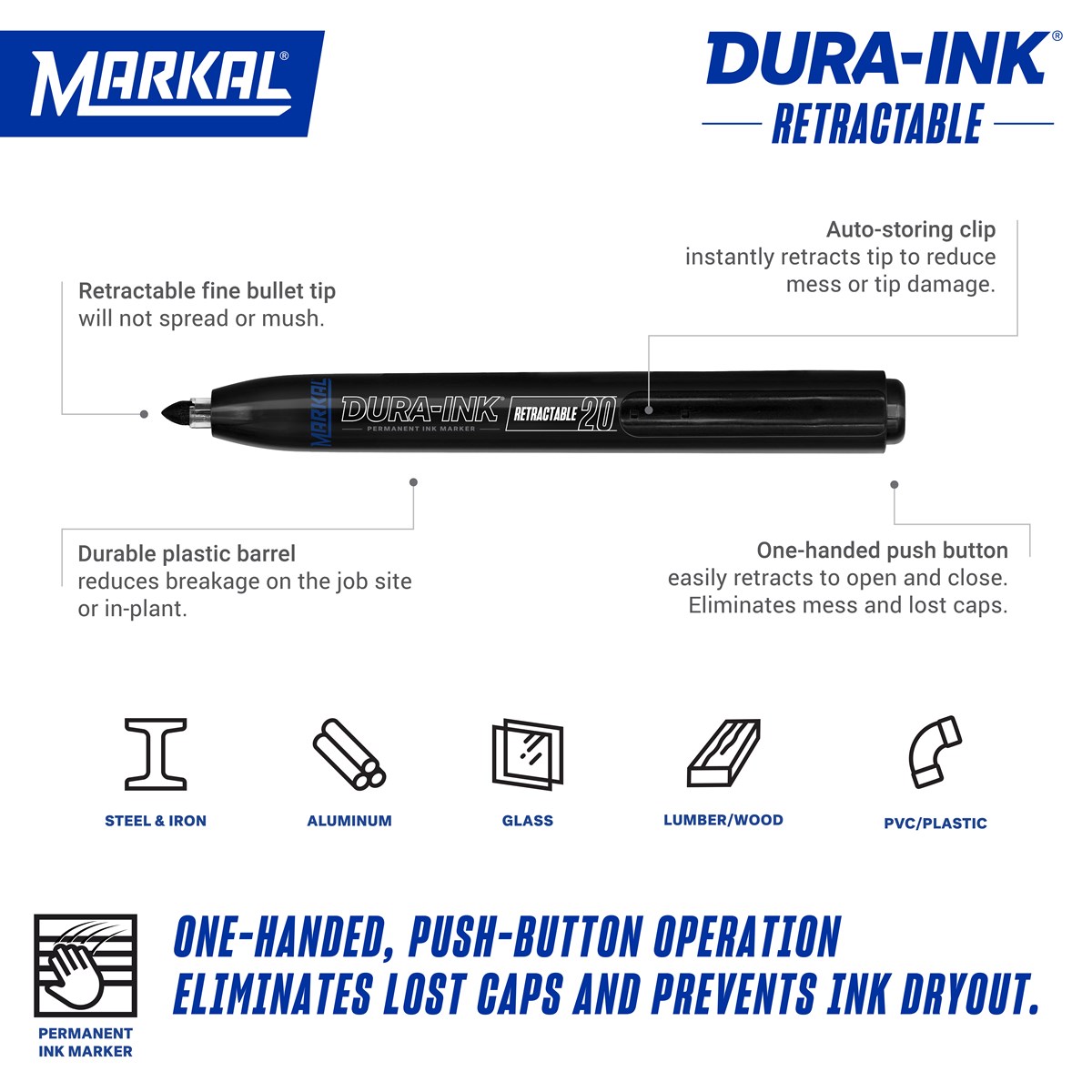 Den här märkpennan är perfekt för dig som behöver göra tydliga och hållbara markeringar på olika material. Den har en smart tryckknapp som gör att du kan öppna och stänga den med bara en hand, vilket är praktiskt när du har mycket att göra. Du behöver aldrig mer leta efter borttappade lock!