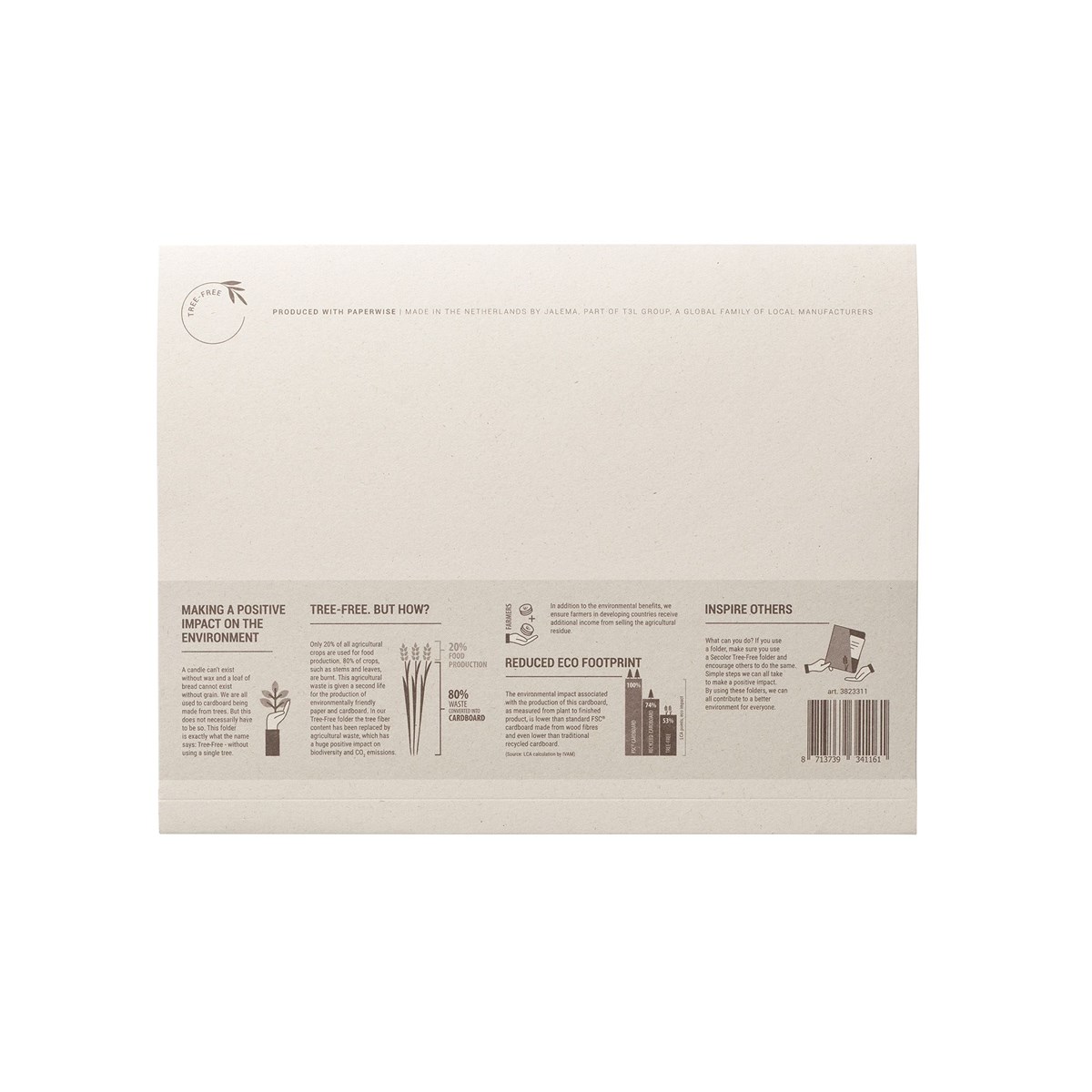 Tillsammans tar vi hand om människor och miljö! Träden får stå kvar, skörden används optimalt, jordbruksavfall får nytt liv och bönder får mer pengar för sin skörd. Jordbruksavfall förbränns oftast, vilket leder till CO2-utsläpp. Genom att istället använda jordbruksavfall till kartong får det ett andra liv, och CO2 förblir lagrad i kartongen. Miljöpåverkan av denna kartong är 47 % lägre än kartong från träd och 29 % lägre än återvunnen kartong. Genom att köpa dessa pärmar får småbönder i utvecklingsländerna inkomst inte bara för den del som blir mat (cirka 20 % av skörden), utan också för jordbruksavfallet. Inget trä används i denna kartong. Produktspecifikation: Designad för lösbladsarkivering av dokument som inte kan perforeras (som fotografier, originaldokument och broschyrer). Dubbel kil på kortsidan för att hålla informationen säker. Toppen är täckt av en stor flik. Behöver inte tas ur fickan för att synas. Lagringskapacitet: 30 mm. Förpackad pr 10 st. Storlek: (A4) 21 x 29,7 cm.