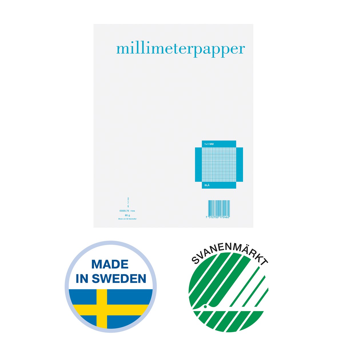 Svensktillverkade millimeterpapper i A4-format. Tillverkade i ISO-certifierat tryckeri i skånska Göingebygden. Råvaror köps in från pappersbruk i Sölvesborg, i närområde till fabriken. Svanenmärkta, licensnummer 3041 0461. Perfekt för att använda i skolan eller i arbetet. 1x1 mm stora rutor.