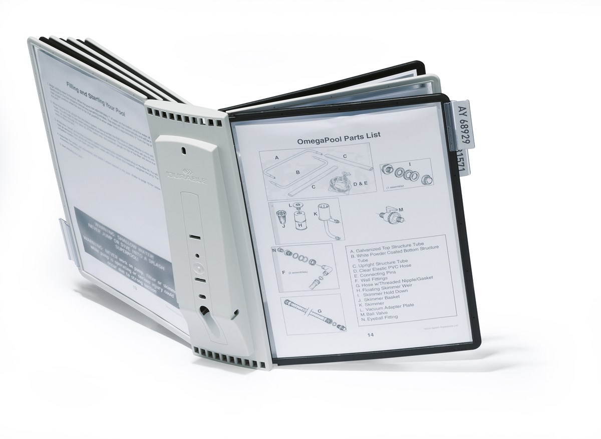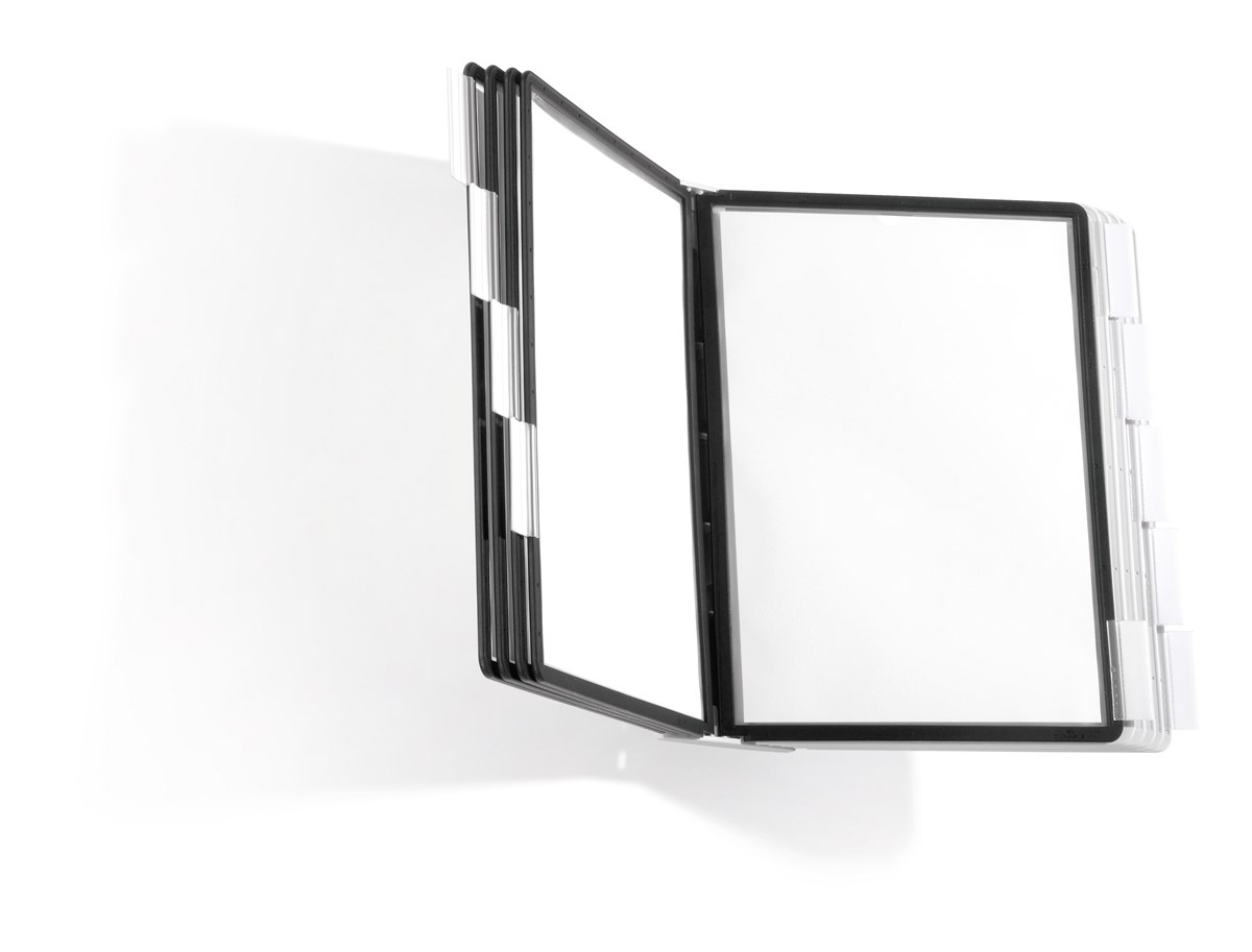 Komplett väggställ med 10 A4-paneler (svarta och grå) samt transparenta rubrikhållare (58 mm) med vita instick. Enkel att bläddra i, för t.ex. prislistor och viktiga anteckningar. Tillverkad av ABS-plast. Paneler i reflexfri polypropylen. Monteras direkt på väggen, en eller flera bredvid varandra. 5 års garanti.