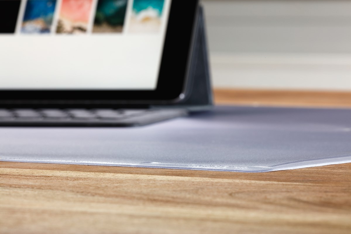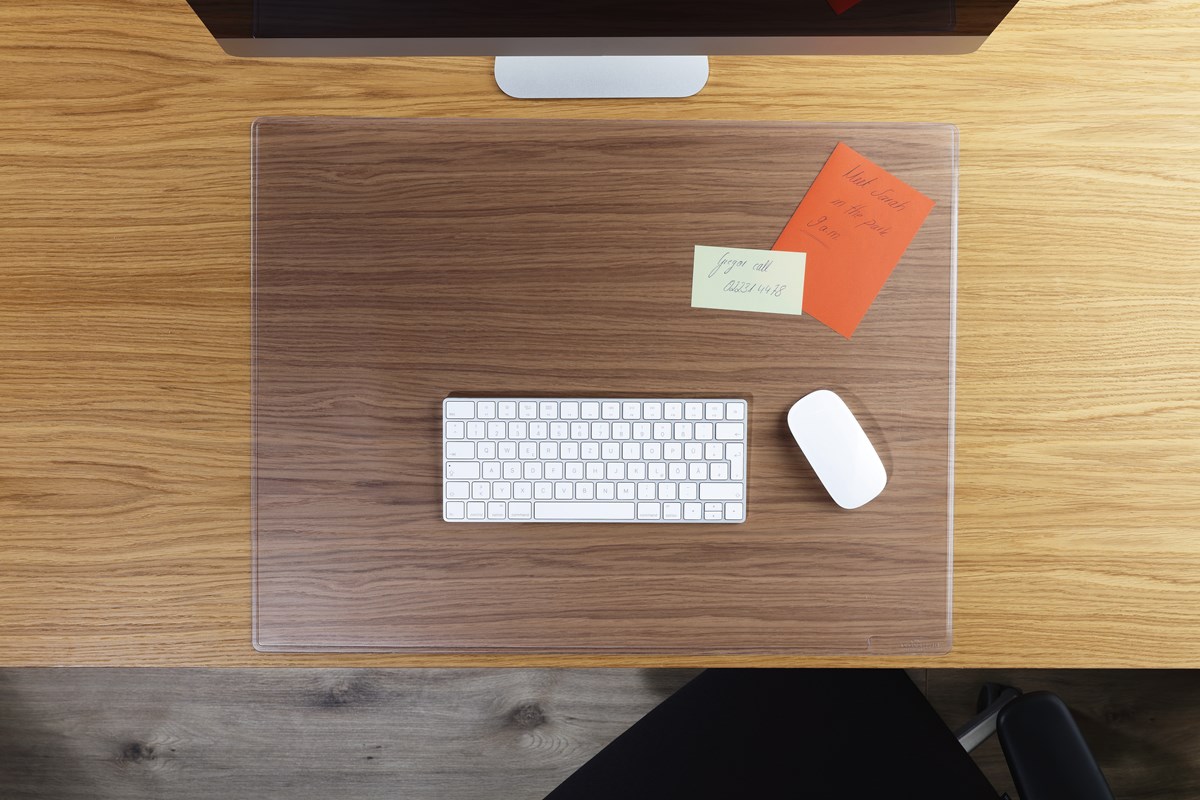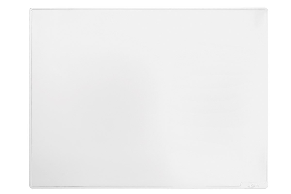 Skrivvänligt med matt/transparent specialplast med antiglidyta. Skyddar men döljer inte ett vackert skrivbord. Tillverkad i PVC.