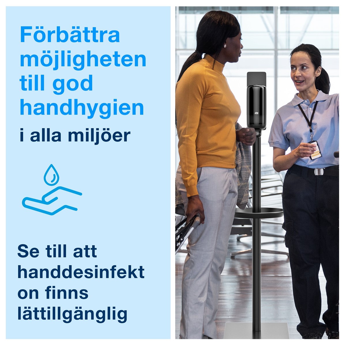 Golvställ som tillhandahåller handdesinfektion när vatten inte finns tillgängligt och påminner dina anställda om handhygien. Stabil och robust design. Kompatibel med både manuella och sensordrivna dispensrar för handdesinfektion. Passar Tork hållare S1 och S4. Plats för en dispenser. Mått ställ: 147,6 x 50 cm.