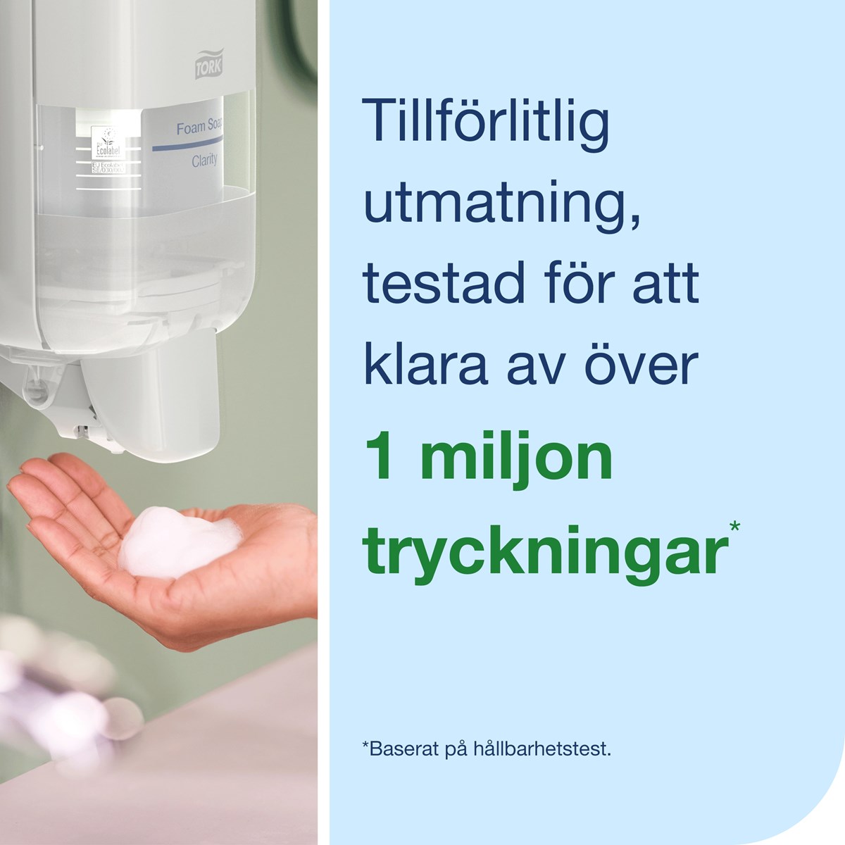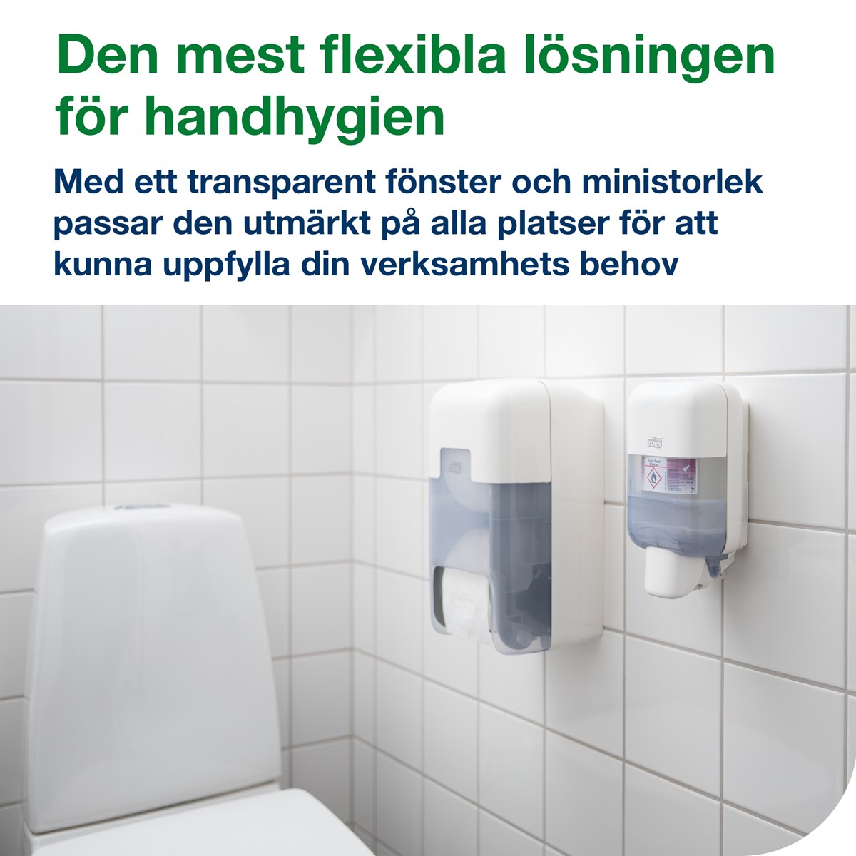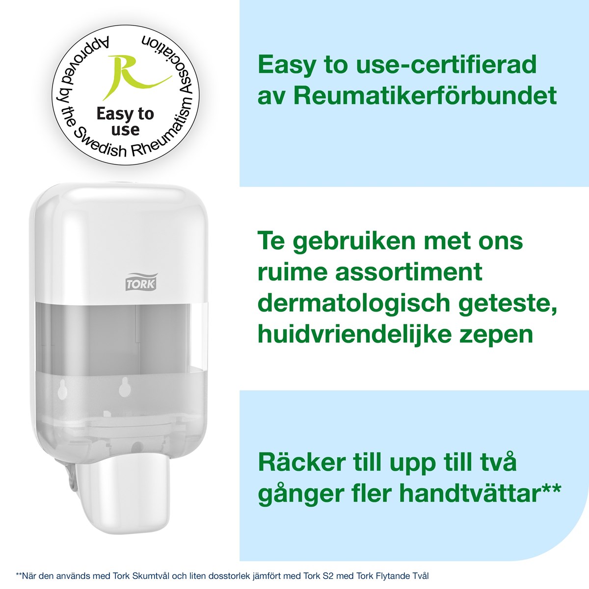 - Ger dubbelt så många handtvättar (när den används med Tork Skumtvål och liten dosstorlek, jämfört med Tork S2 med Tork Flytande Tvål)