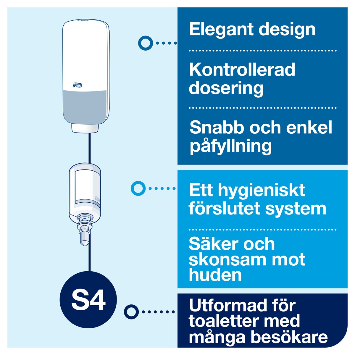 Modern design Enkel att använda och rengöra Beröringsfri dosering för förbättrad hygien Påfyllningsindikator som ökar personalens effektivitet