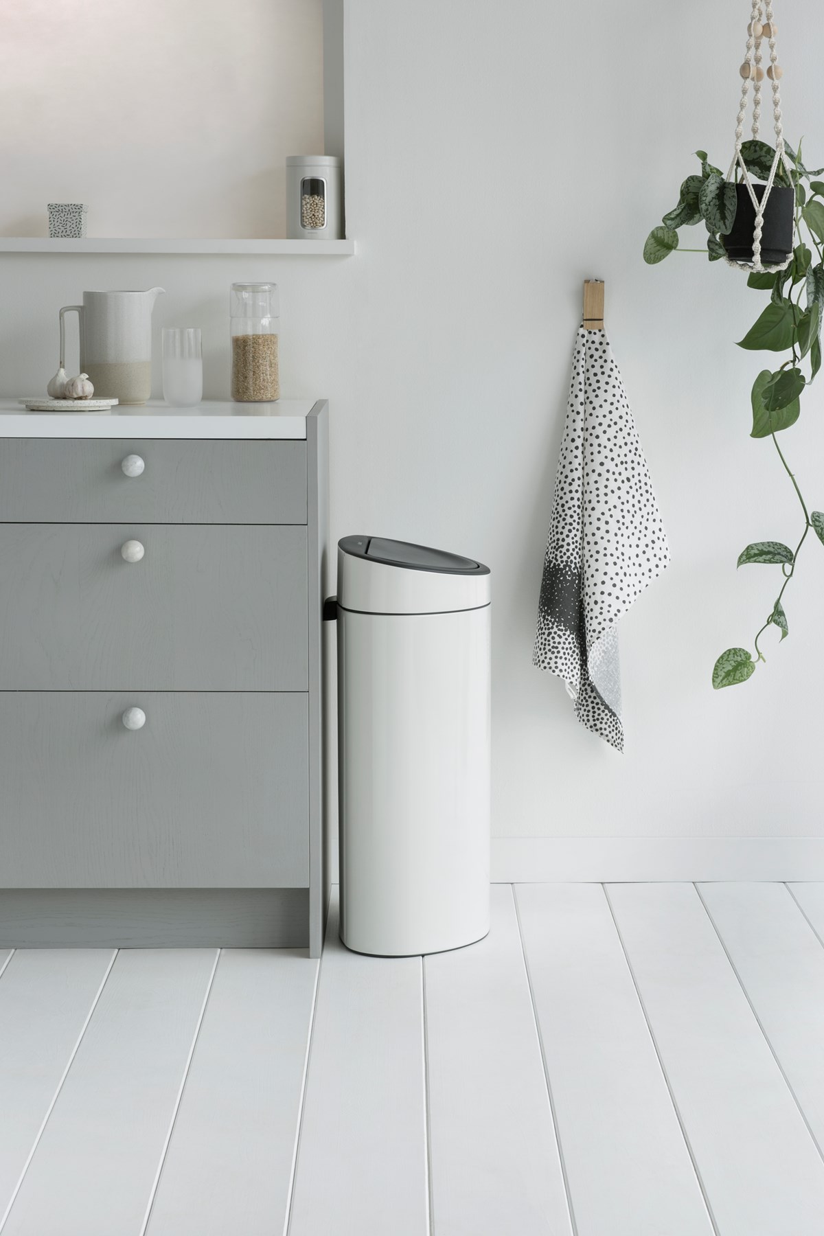 Tack vare en ”softtouch”-mekanism öppnas locket automatiskt och ljudlöst med ett enkelt tryck. Avtagbart lock i rostfritt stål och en urtagbar innerhink för enkel rengöring. 40-literstunnan har platt baksida och är därmed platsbesparande och enkel att placera. Tillverkade av 79% återvunnet material, 99% återvinningsbar efter användning. 10 års garanti. Mått: 435 x 302 x 727 mm.