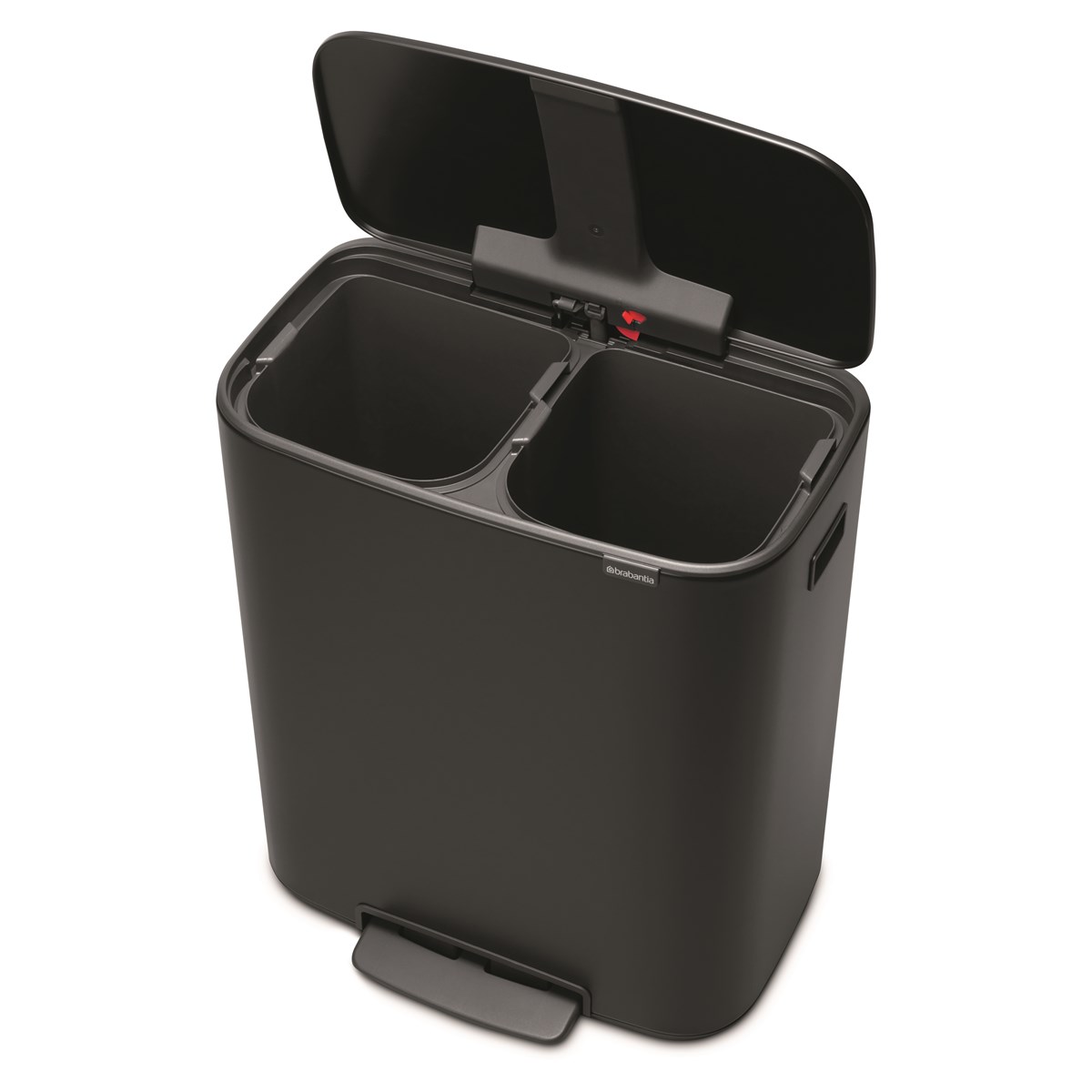 Perfekt för källsortering - två avtagbara plastinnerhinkar Rymlig - XXL volym (2 x 30L) Smidig - ett mjukstängande lock med ett lätt tryck på pedalen Lätt att flytta - två robusta integrerade handtag