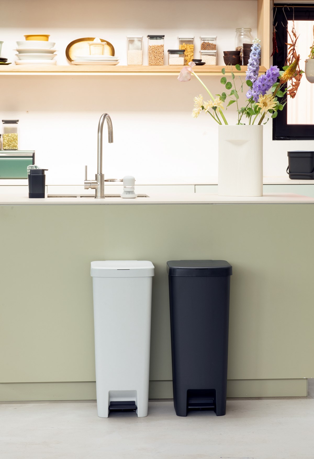 Steppa upp din återvinning med Brabantias StepUp pedalhink 40L! Tillverkad av 91% återvunnet avfall och för återvinning av avfall. Med en klicketiketthållare för dina egna avfallsetiketter och en praktisk påsförvaring inuti. Mjuk stängning - locket stängs smidigt. Ingen ful kant av påsen - matchande Brabantia PerfectFit avfallspåsar med knytband finns tillgänglig. Stort grepp på baksidan gör det enkelt att flytta tunnan. 10 års garanti.