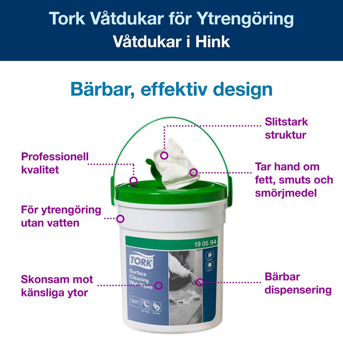 Våtdukar med professionell kvalitet för effektiv ytrengöring Tåliga nog att snabbt ta bort envist smuts Bärbar hink