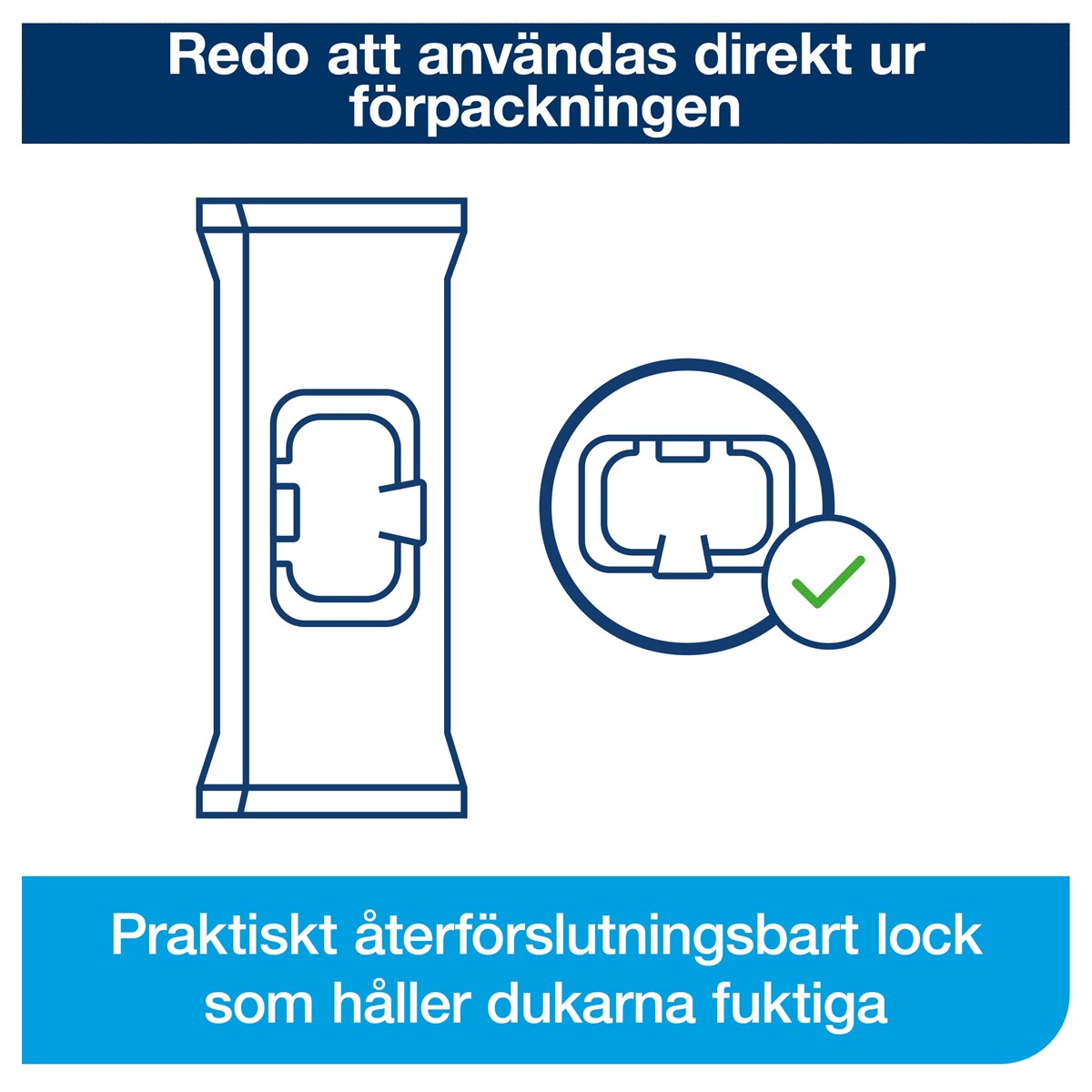 Ett desinfektionsmedel som är redo att användas och effektivt mot ett brett spektrum av bakterier och virus, inklusive coronavirus. Det är dermatologiskt testat och fritt från etanol. Lämpliga för användning på hårda, icke porösa ytor och föremål. De levereras i flow pack om 60 dukar med återförslutningsbart lock för att våtdukarna inte ska torka ut.