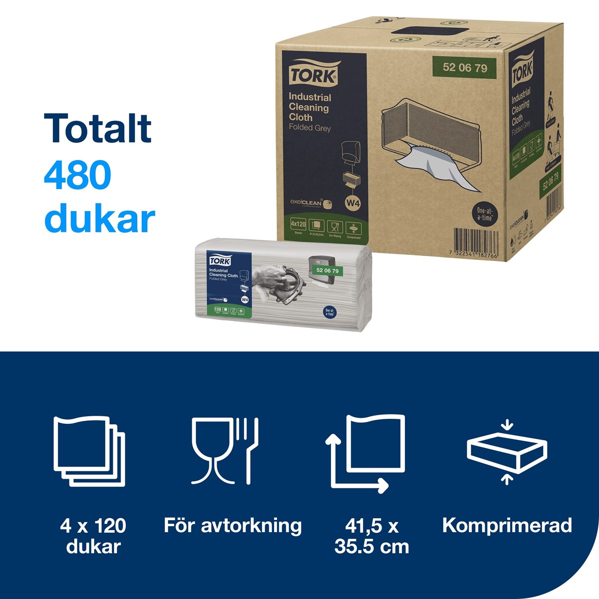 Att hantera smuts i trånga utrymmen är enkelt med våra flexibla industriella rengöringsdukar. De är dessutom mjuka, så att personalen snabbt och enkelt kan städa även på svåråtkomliga ytor. För att ha enkel tillgång rekommenderas Tork W4-dispenser för rengöringsdukar. Eftersom endast en duk matas ut i taget tar besökare bara det de behöver, vilket bidrar till mindre avfall. 1-lagers. Premium-kvalitet. Vikt storlek: D 10.8 cm B 35.5 cm. Ovikt storlek: D 41.5 cm B 35.5 cm. Passar med W4 dispensrar.