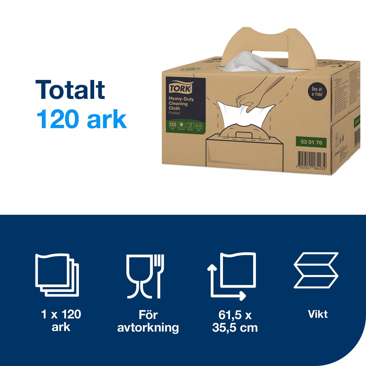 Utmanande uppgifter kräver en rengöringsduk som är slitstark och absorberande. Vår 1-lagers rengöringsduk kan användas med de flesta lösningsmedel för att snabbt ta hand om olja, fett och vätskespill. Rengöringsdukarna är extra stora och arken levereras kedjevikta för att underlätta städningen. De hjälper också till att göra din arbetsplats grönare eftersom exelCLEAN®-materialet kräver upp till 41 % mindre lösningsmedel än trasor, vilket gynnar både miljön och personalens hälsa. Effektiviteten förbättras också tack vare vår bärbara och lätta Tork Handy Box. 1-lagers. Premium-kvalitet. Vikt storlek: D 10.8 cm B 35.5 cm. Ovikt storlek: D 61.5 cm B 35.5 cm. Passar med W7 dispensrar.