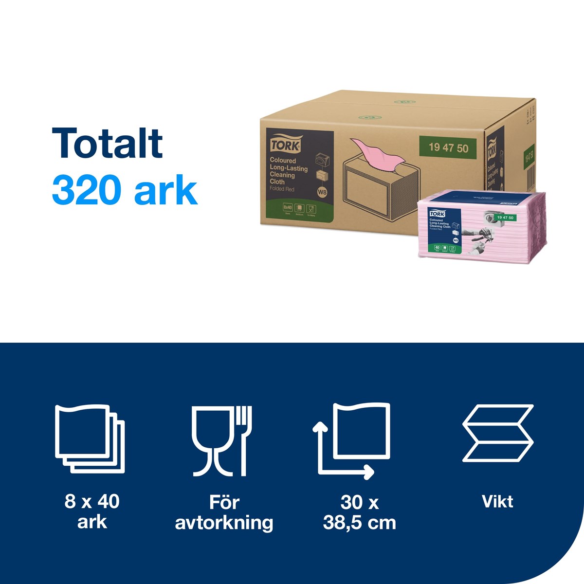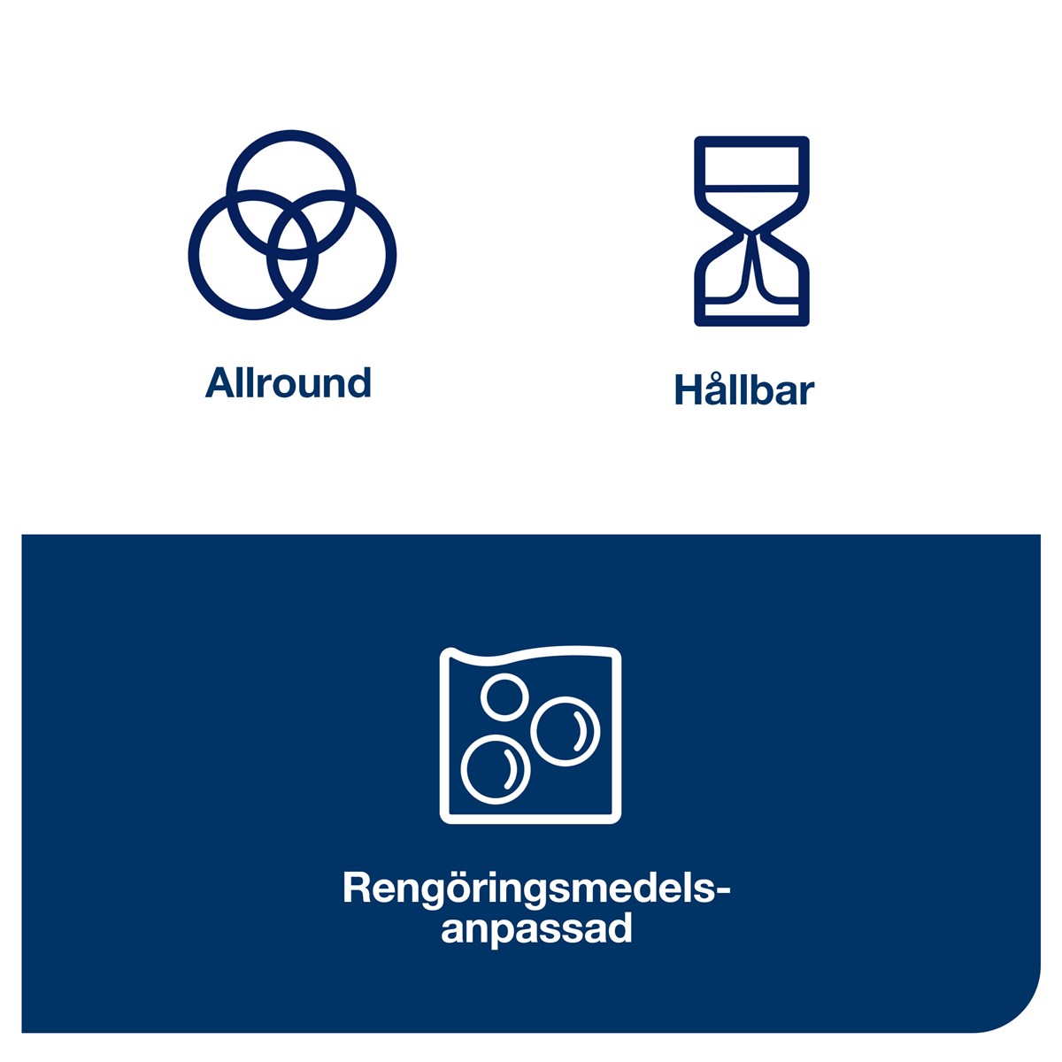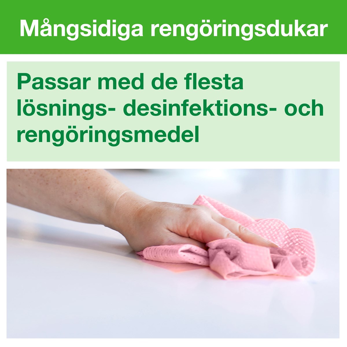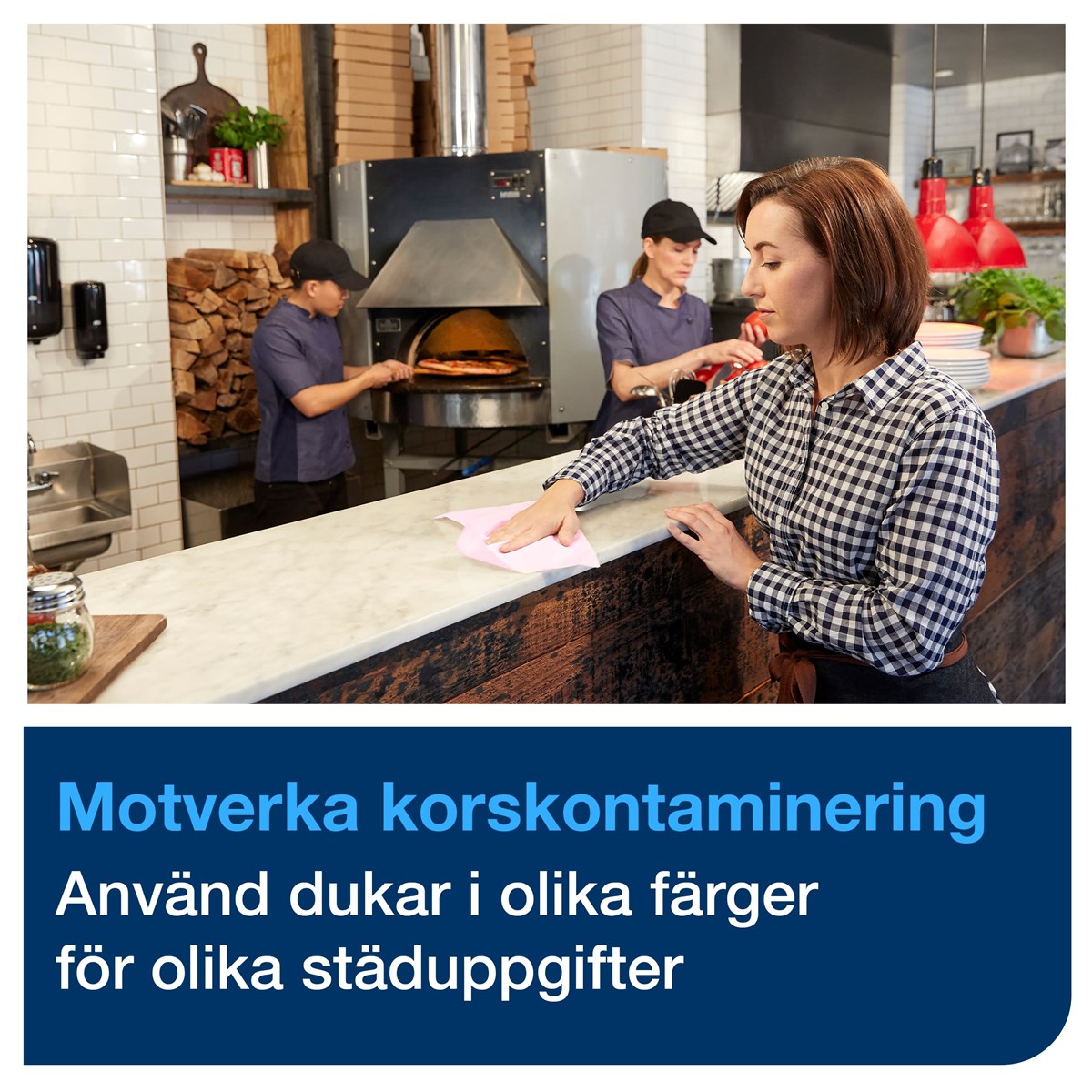 Tålig städ- och rengöringsduk i nonwovenmaterial som kan användas gång på gång utan att gå sönder. Finns i fyra olika färger för att förhindra korskontaminering. Godkänd för livsmedelskontakt. Mått: 30 x 38 cm. 40 dukar/förp.