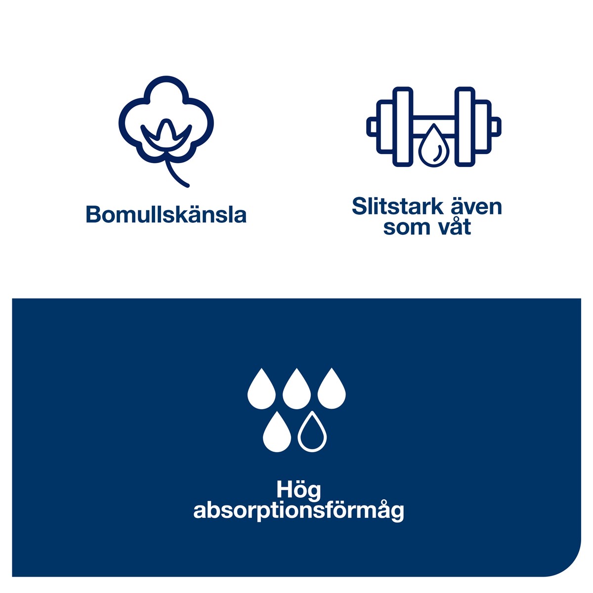 Allround-dukar för alla sorters spill i köket Tåliga och extra absorberande Värmebeständiga Biobaserad design och återvunnen förpackning för minskad miljöpåverkan Tork Easy Handling® förpackning för enklare förpackningshantering