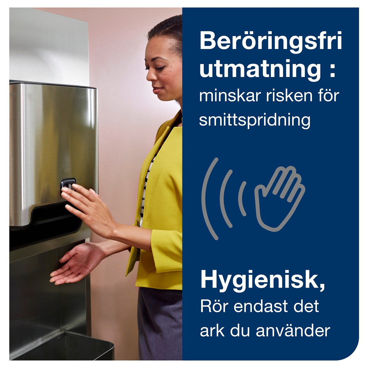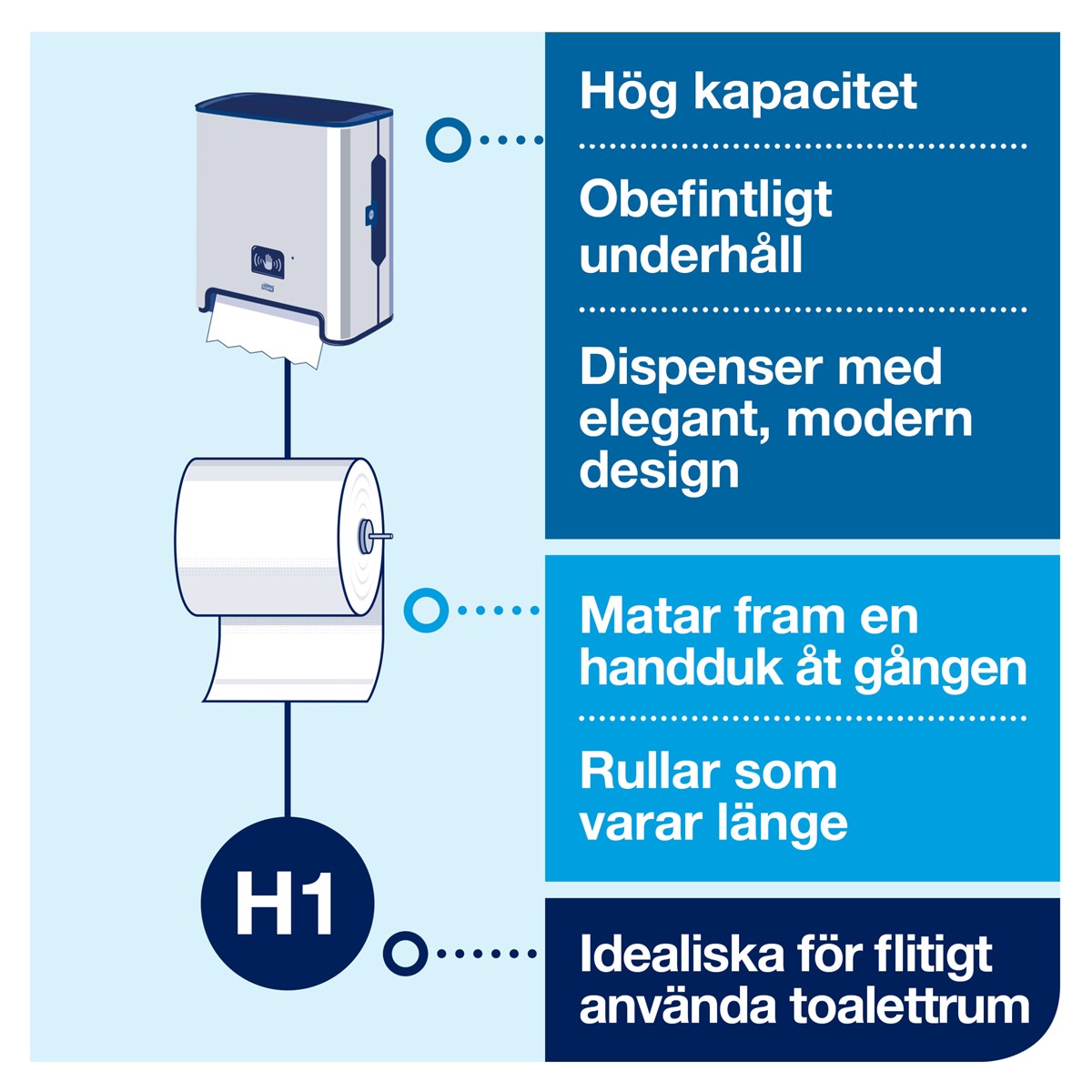 En handduk åt gången; minskar förbrukningen Beröringsfri utmatning LED-refillindikatorn som visar när påfyllning krävs Hög kapacitet