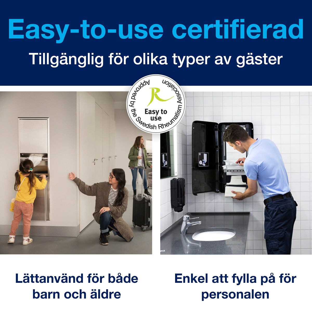 250 % högre kapacitet med 2 100 pappershanddukar i en slimmad behållare För välbesökta toalettutrymmen Smidig utmatning på tre sekunder Komprimerade buntar sparar plats på lager och på städvagnar