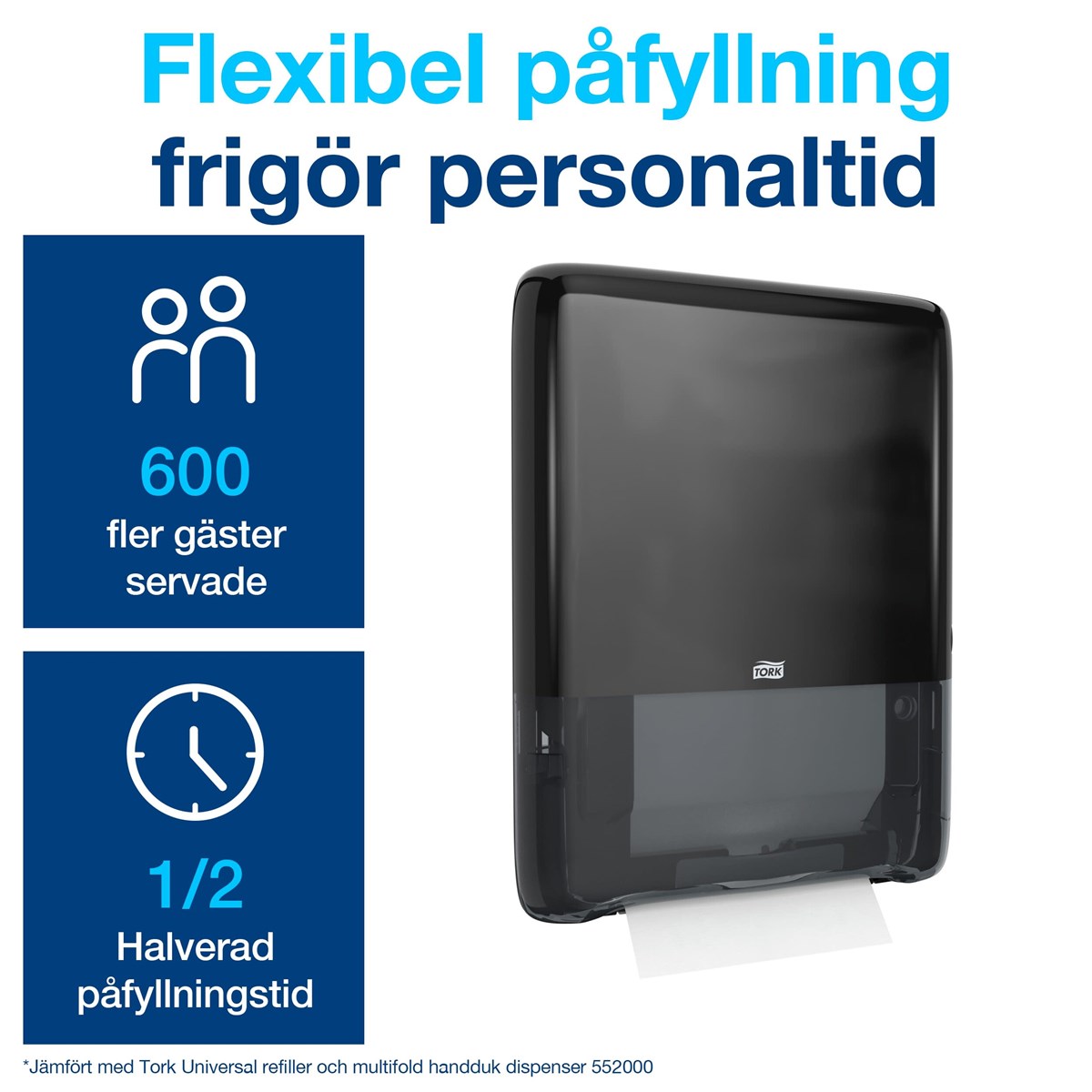 Hög kapacitet på 1 230 handdukar För välbesökta toalettutrymmen Smidig utmatning på bara tre sekunder Extra slimmad och utrymmessnål design Refillhanddukarna är komprimerade med 50 % vilket underlättar förvaring