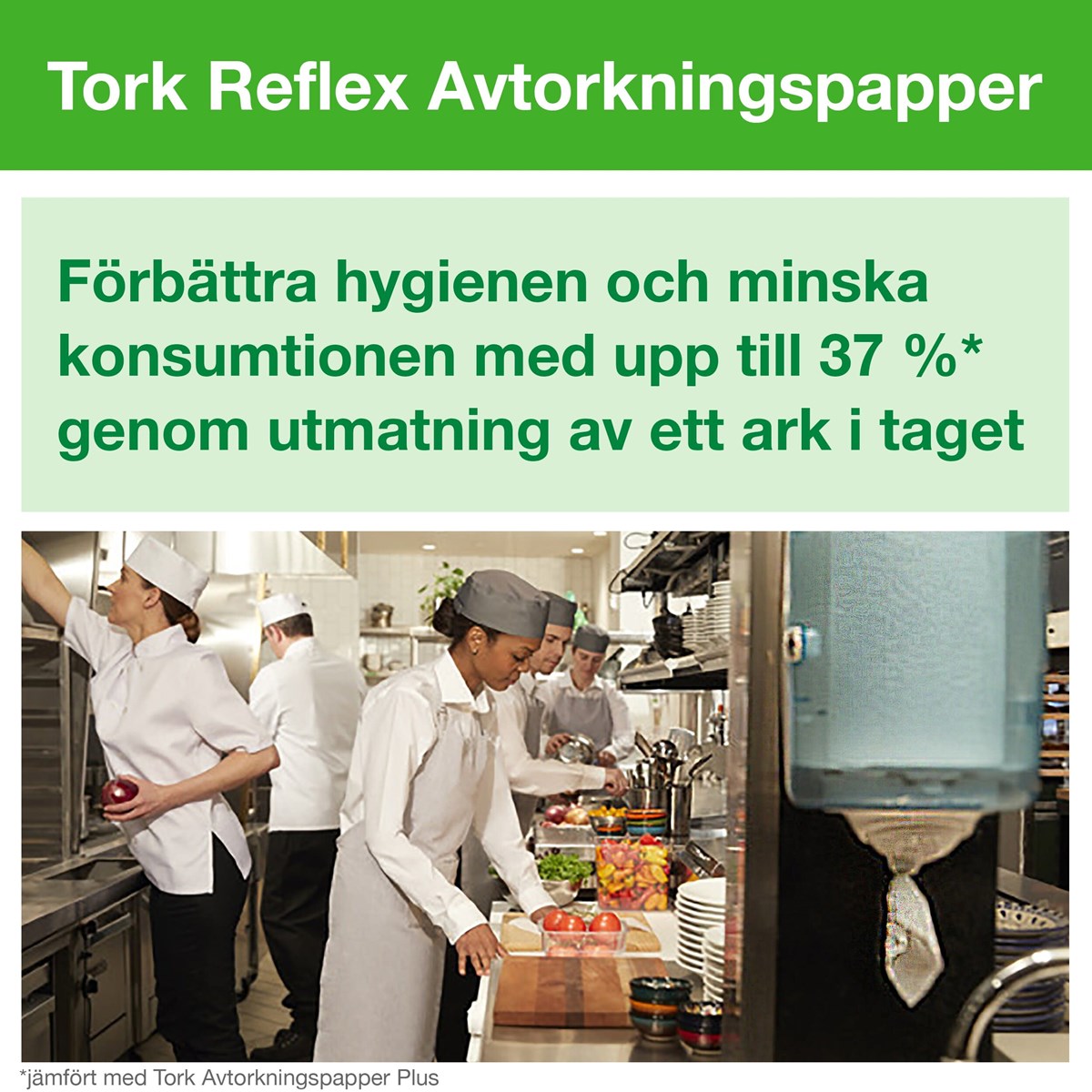 Tork Reflex® Avtorkningspapper är ett 1-lagerspapper vars styrka och höga absorptionsförmåga gör att det passar perfekt för både avtorkning och för att torka händerna. Detta papper kan användas i Tork Reflex® Centrummatad dispenser som matar ut ett ark i taget och passar ditt teams arbetsflöde, minskar åtgången och minimerar risken för smittspridning. Speciellt lämpligt för rengöring av glas – lämnar inte något ludd eller några ränder på ytan.