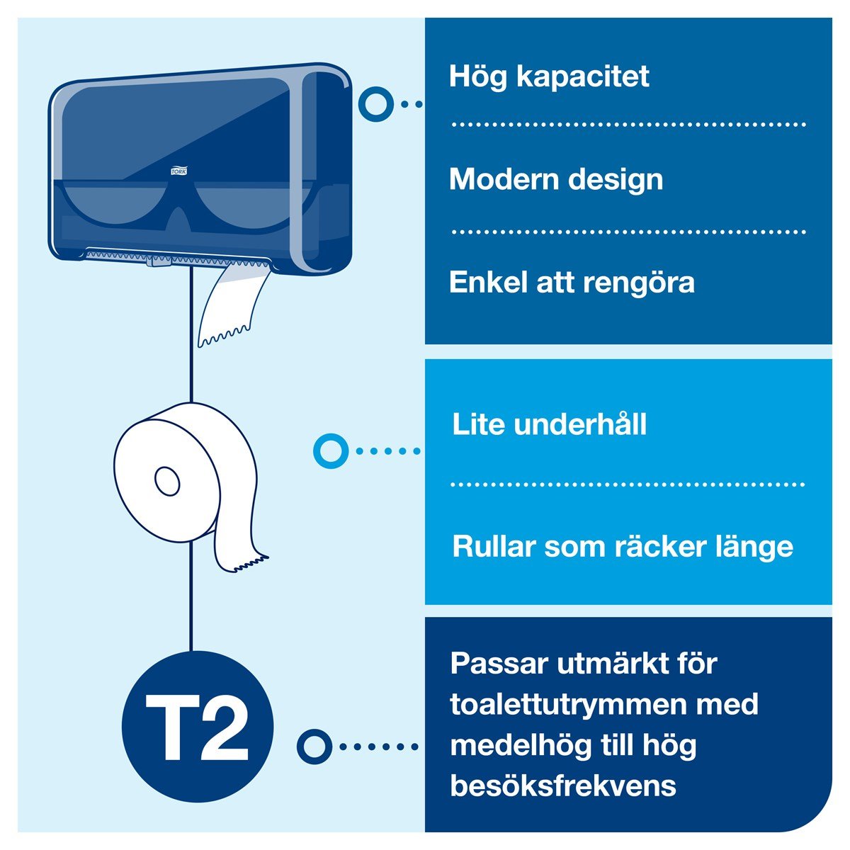 För välbesökta toalettutrymmen Sluten dispenser som skyddar rullarna och förbättrar hygienen Hög kapacitet för färre påfyllningar Optimal rullbroms minskar förbrukningen Använd båda rullarna fullt ut för att minska avfallet