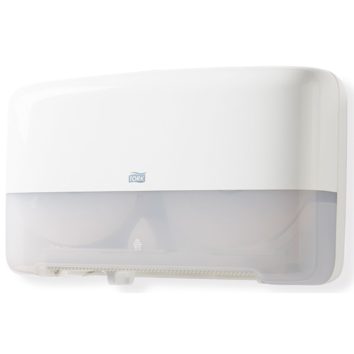 Modern hållare med hög kapacitet. För två Mini Jumbo T2-rullar. En rulle i taget används. Tillverkad i kraftig plast, låsbar. Mått: (H x B x D) 25,6 x 43,2 x 14,6 cm.