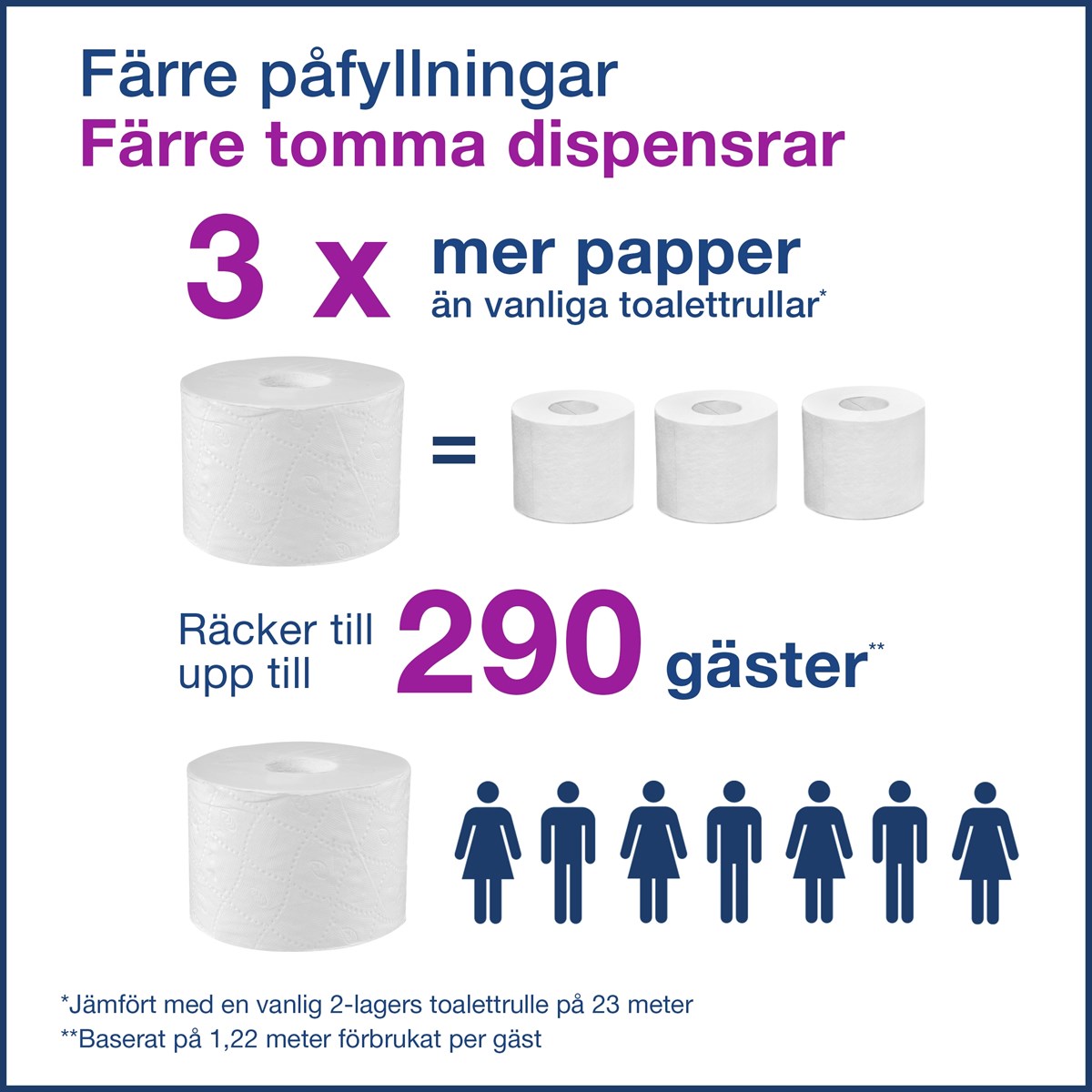 Perforerat 2-lagers toalettpapper utan hylsa med attraktiv design Undvik att pappret tar slut med 3 gånger mer papper än vanliga rullar Kompakta rullar – spara tid med färre påfyllningar Varken hylsa eller omslag innebär mindre avfall Tar upp hälften så mycket förvaringsplats som vanliga toalettrullar