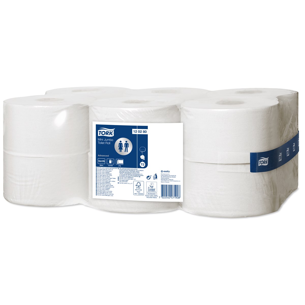 Vitt, 2-lags toalettpapper av god kvalitet (Advanced). Dekorprägling i grått. Perforerat. 170 m/rulle. 12 rl/förp.